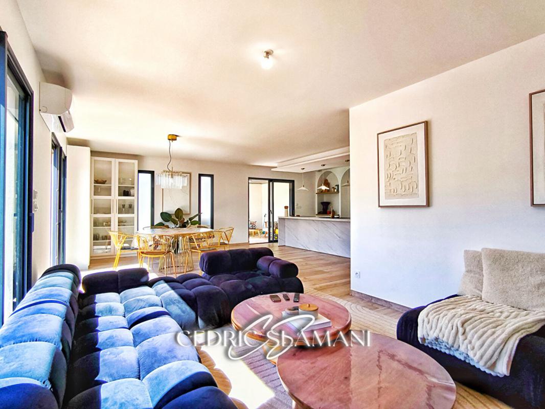 Un vaste double séjour moderne et baigné de lumière, ouvert sur l'extérieur grâce à de larges baies vitrées.