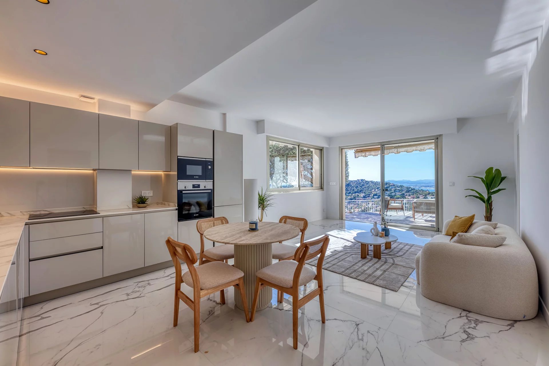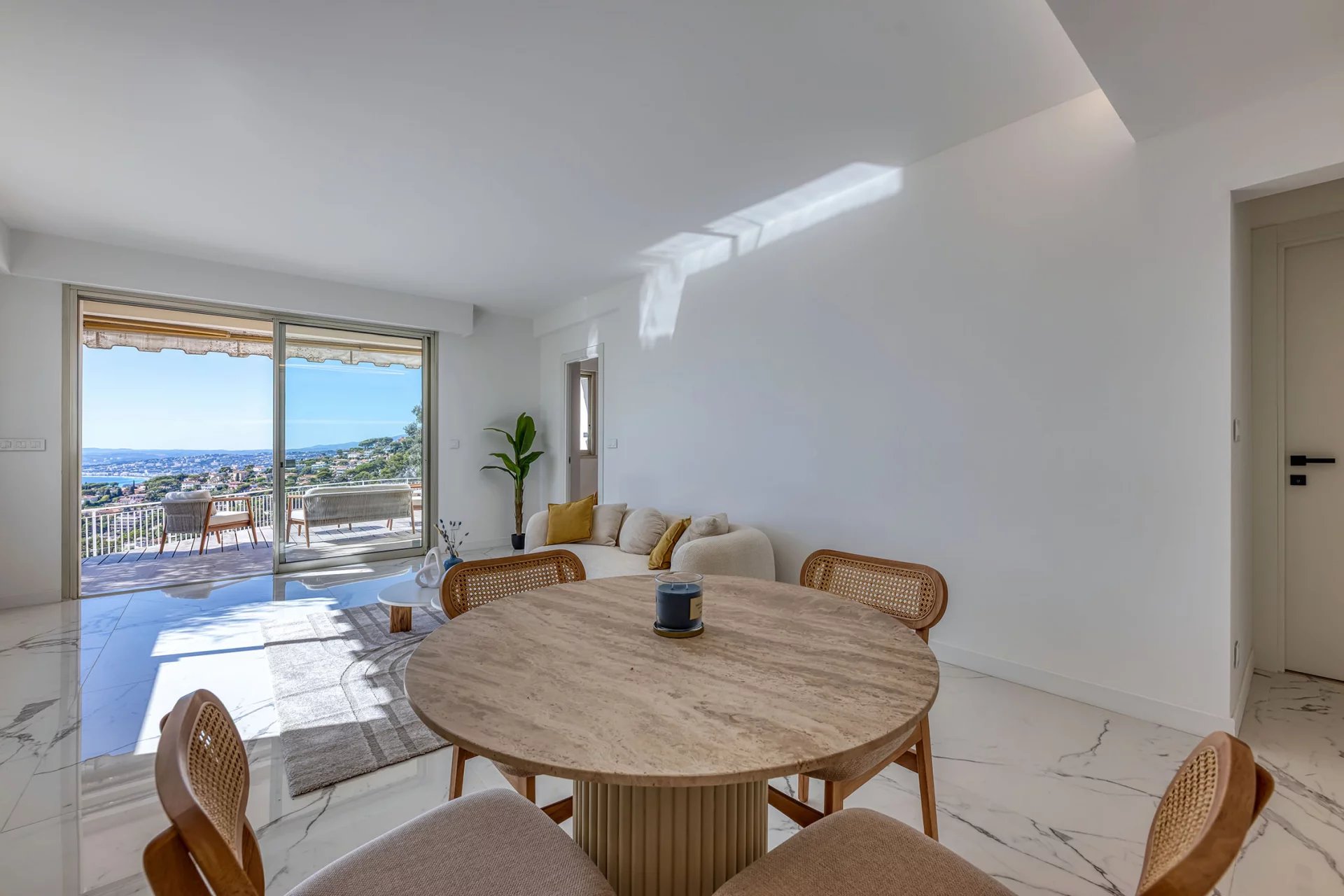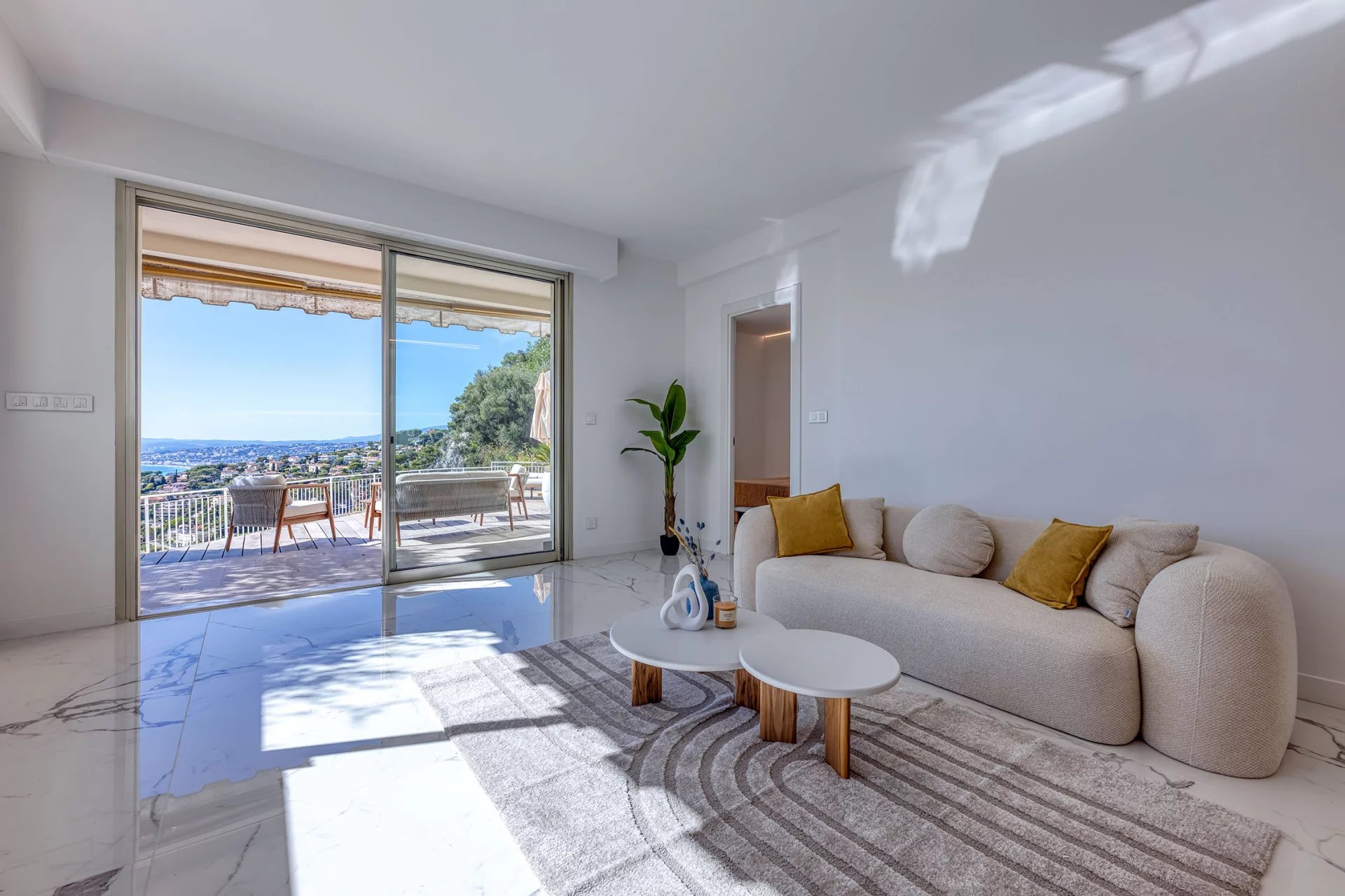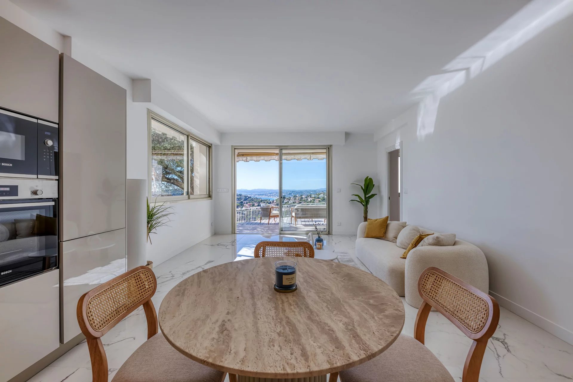 Ce superbe appartement de 62 m², entièrement rénové avec des matériaux haut de gamme, domine la baie de Villefranche, le Cap-Ferrat et jusqu’à Villeneuve-Loubet.