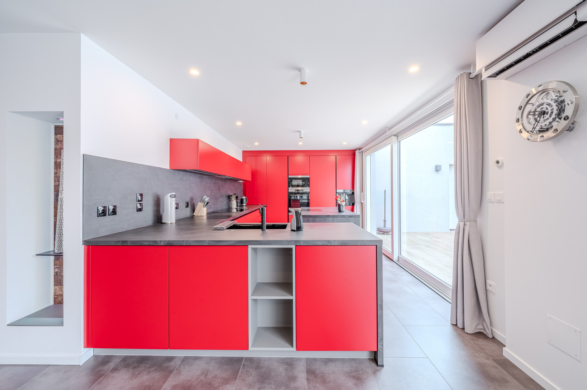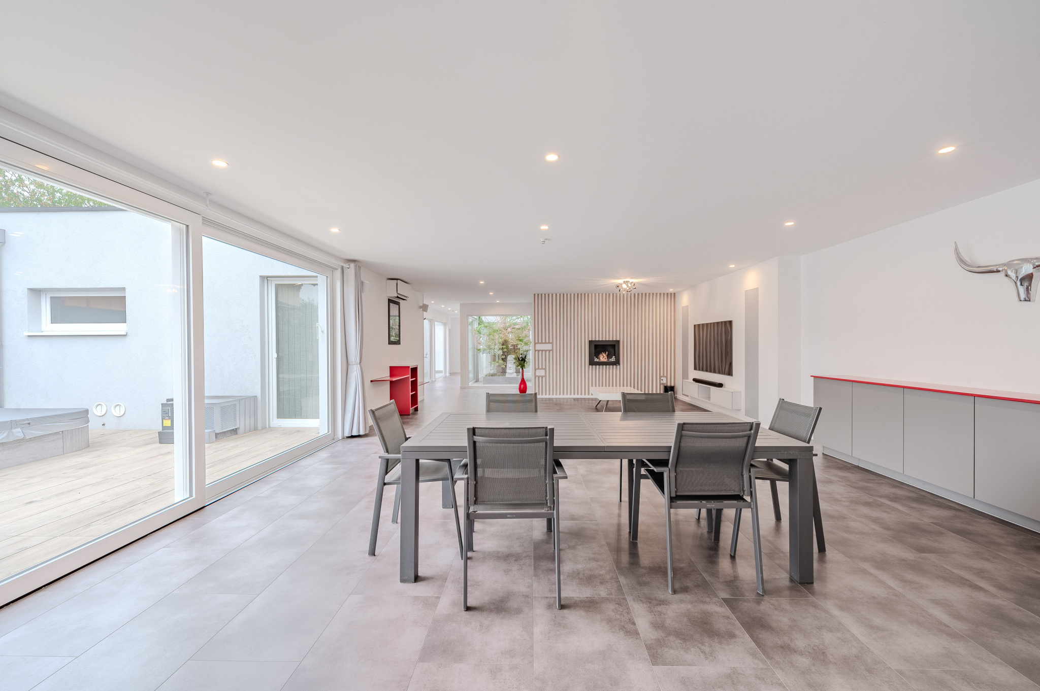 La partie « jour » est composée d'une exceptionnelle pièce de vie de 75 m2 ouverte sur un patio/terrasse de 75 m2 aménagé avec un SPA de nage (chauffé) équipé de jets BIEN ETRE, et d'une magnifique cuisine de 25 m2 intégralement équipée jusqu'à la machine à café à grains intégrée ! Bien entendu, dans la continuité, vous trouverez un cellier par une porte dérobée, puis un sas permettant l'accès au garage 2 voitures qui conforte le côté très fonctionnel de ce bien d'exception.