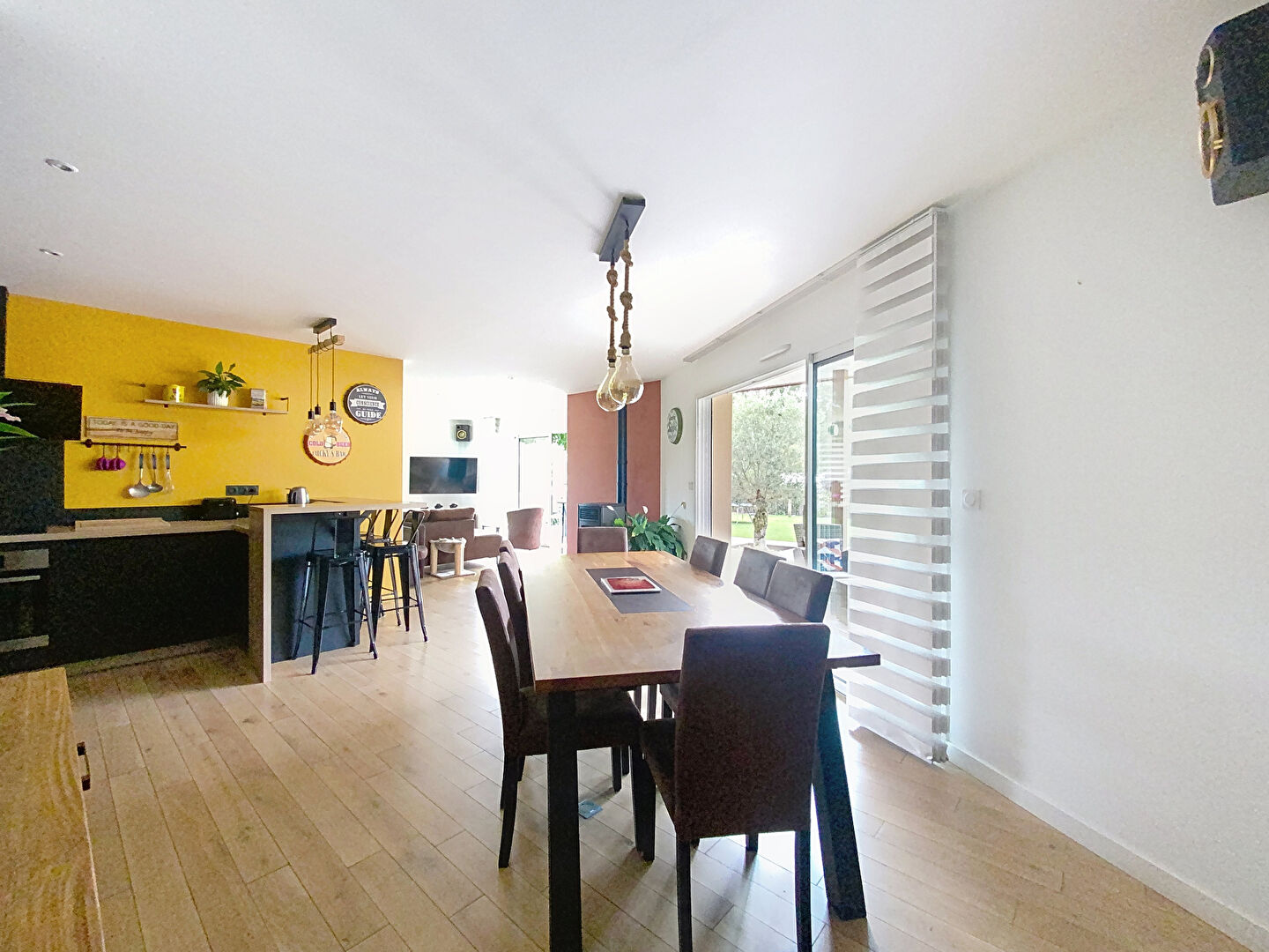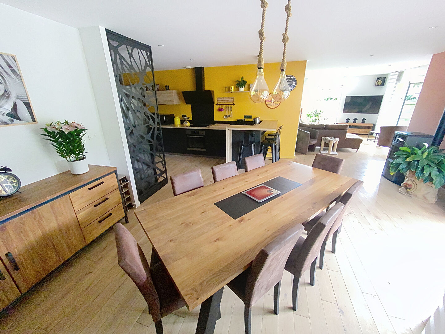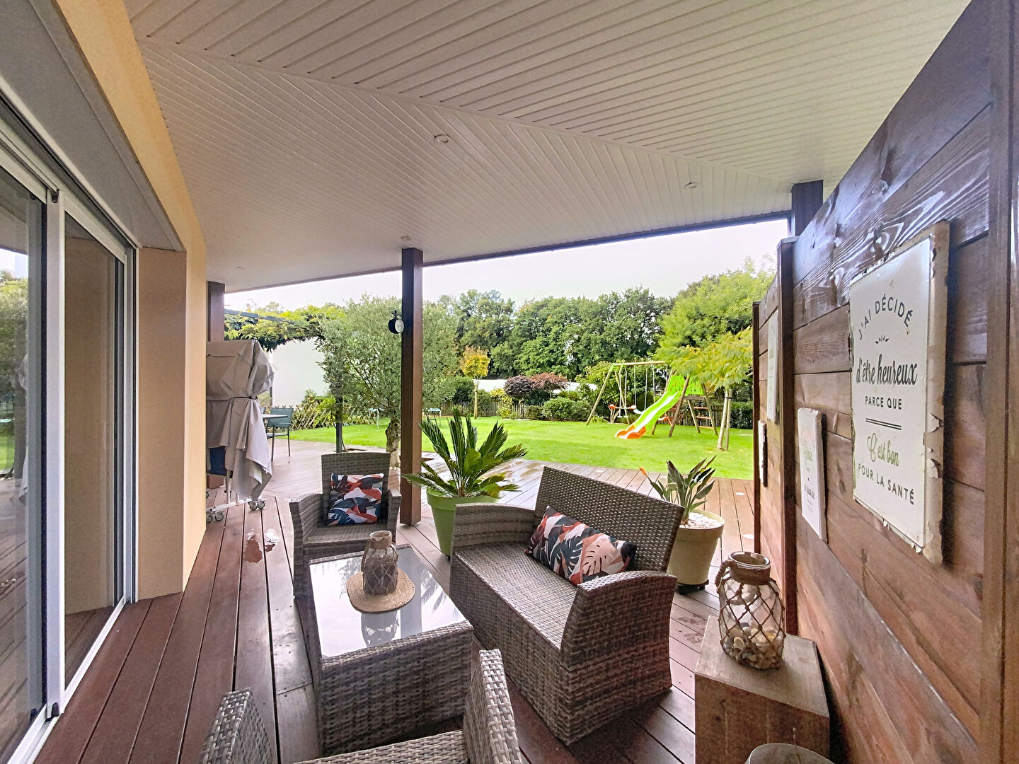 Cet espace de vie s'ouvre avec des baies vitrées sur une grande terrasse, permettant de profiter en hiver comme en été du jardin et de la verdure qui caractérisent ce havre de paix.