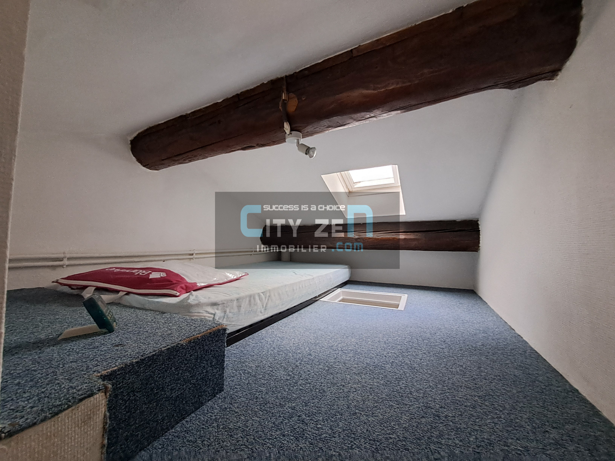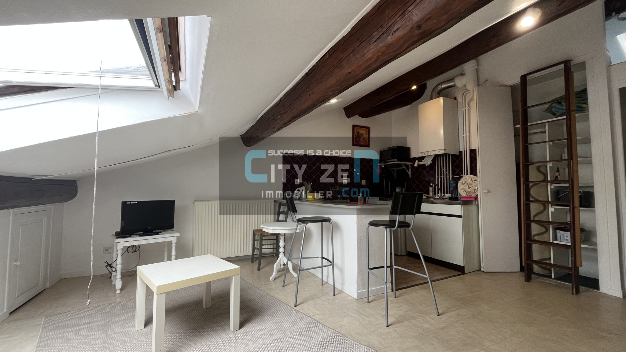 L'appartement se compose d'une pièce principale lumineuse comprenant un coin cuisine et un espace séjour, d'une pièce d'eau avec baignoire, lavabo et sanitaires, ainsi que d'une mezzanine servant de coin nuit.