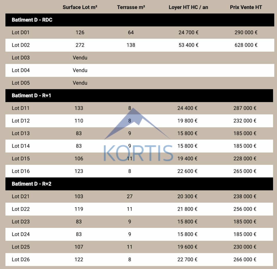 Situé à Limas, à proximité immédiate de l'autoroute A6 et du centre-ville de Villefranche-sur-Saône, cet ensemble immobilier offre un emplacement stratégique le long d'un axe très fréquenté, garantissant une excellente visibilité et une accessibilité optimale.Les espaces, à partir de 83 m², bénéficient de prestations de qualité, de terrasses privatives pour certains lots et de stationnements dédiés. Les lots sont proposés à la vente ou à la location.Bâtiment D ? RDC Lot D01 : 126 m² ? Loyer 24 700 Euros HT/HC/an ? Prix 290 000 Euros HT Lot D02 : 272 m² ? Loyer 53 400 Euros HT/HC/an ? Prix 628 000 Euros HTBâtiment D ? R+1 Lot D11 : 133 m² ? Loyer 24 400 Euros HT/HC/an ? Prix 287 000 Euros HT Lot D12 : 110 m² ? Loyer 19 800 Euros HT/HC/an ? Prix 232 000 Euros HT Lot D13 : 83 m² ? Loyer 15 800 Euros HT/HC/an ? Prix 185 000 Euros HT Lot D14 : 83 m² ? Loyer 15 800 Euros HT/HC/an ? Prix 185 000 Euros HT Lot D15 : 106 m² ? Loyer 19 400 Euros HT/HC/an ? Prix 228 000 Euros HT Lot D16 : 123 m² ? Loyer 22 600 Euros HT/HC/an ? Prix 265 000 Euros HTBâtiment D ? R+2 Lot D21 : 103 m² ? Loyer 20 300 Euros HT/HC/an ? Prix 238 000 Euros HT Lot D22 : 119 m² ? Loyer 21 800 Euros HT/HC/an ? Prix 256 000 Euros HT Lot D23 : 83 m² ? Loyer 15 800 Euros HT/HC/an ? Prix 185 000 Euros HT Lot D24 : 83 m² ? Loyer 15 800 Euros HT/HC/an ? Prix 185 000 Euros HT Lot D25 : 107 m² ? Loyer 19 600 Euros HT/HC/an ? Prix 230 000 Euros HT Lot D26 : 122 m² ? Loyer 22 700 Euros HT/HC/an ? Prix 266 000 Euros HTAtouts du site Emplacement stratégique à Limas, aux portes de Villefranche-sur-Saône Bureaux modernes, lumineux et modulables Terrasses privatives sur plusieurs lots Stationnements extérieurs et souterrains Disponibilité immédiate