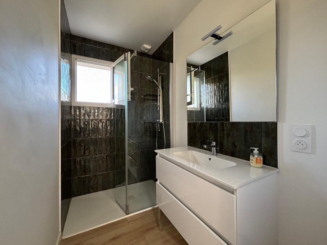 Au rez-de-chaussée, l'entrée avec placard mène à une vaste pièce de vie baignée de lumière, prolongée par une cuisine ouverte entièrement aménagée et équipée. Une suite parentale avec salle d'eau privative, un WC indépendant ainsi qu'un garage attenant de 14 m² complètent ce niveau.