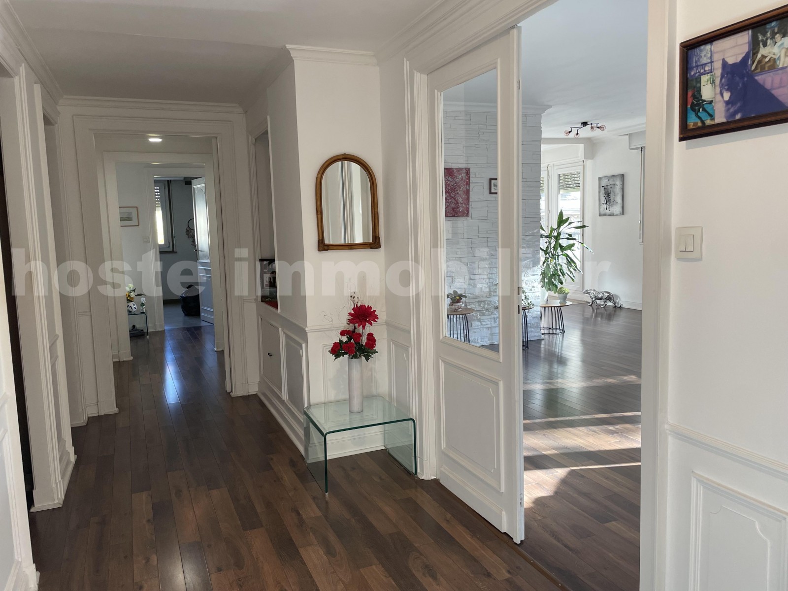 Cet appartement de plus de 100 m² est un véritable coup de c½ur. Dès le hall d'entrée, on ressent l'espace et la lumière qui baignent chaque pièce. La cuisine équipée, ouverte sur la pièce de vie, invite à partager des moments conviviaux tout en profitant d'une belle luminosité. Les deux chambres offrent confort et tranquillité. Une buanderie et un vestiaire apportent un vrai sens pratique au quotidien, et les toilettes sont séparées. Le charme opère aussi à l'extérieur, avec deux balcons, dont un en arrondi, qui laissent entrer le soleil à toute heure du jour. Le parquet au sol renforce la chaleur et l'élégance de l'ensemble. Un grand garage pouvant accueillir deux voitures et deux caves viennent parfaire ce lieu rare, où chaque détail inspire le bien-être.