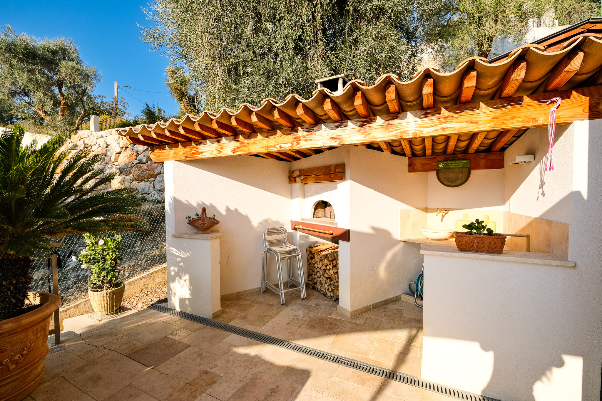 À l'extérieur, un espace cuisine d'été, un salon de jardin et un terrain de pétanque invitent à la convivialité, tandis que la piscine avec coin douche et WC complète ce cadre idyllique. Le terrain entièrement clôturé, agrémenté d'oliviers et d'arbres fruitiers, garantit tranquillité et intimité.