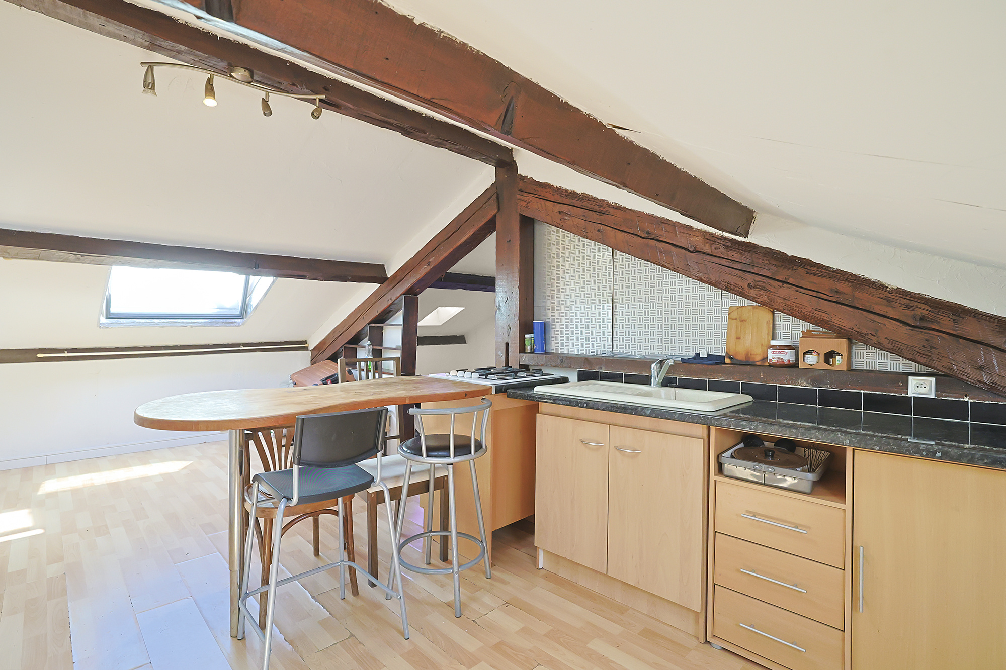 Caractérisé par sa surface bien agencée, ce studio mansardé offre plusieurs espaces de vie confortables et fonctionnels, une salle d'eau séparée avec un receveur et une vasque, un coin nuit isolé et un séjour/cuisine. Le studio mesure 14,55m2 loi carrez, mais offre au sol plus de 18m2 supplémentaires (h< 1.80m).