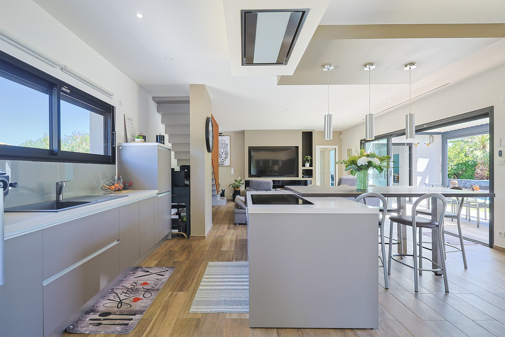 Un espace salon/séjour lumineux grâce à une large baie vitrée, ouvert sur une cuisine équipée moderne.