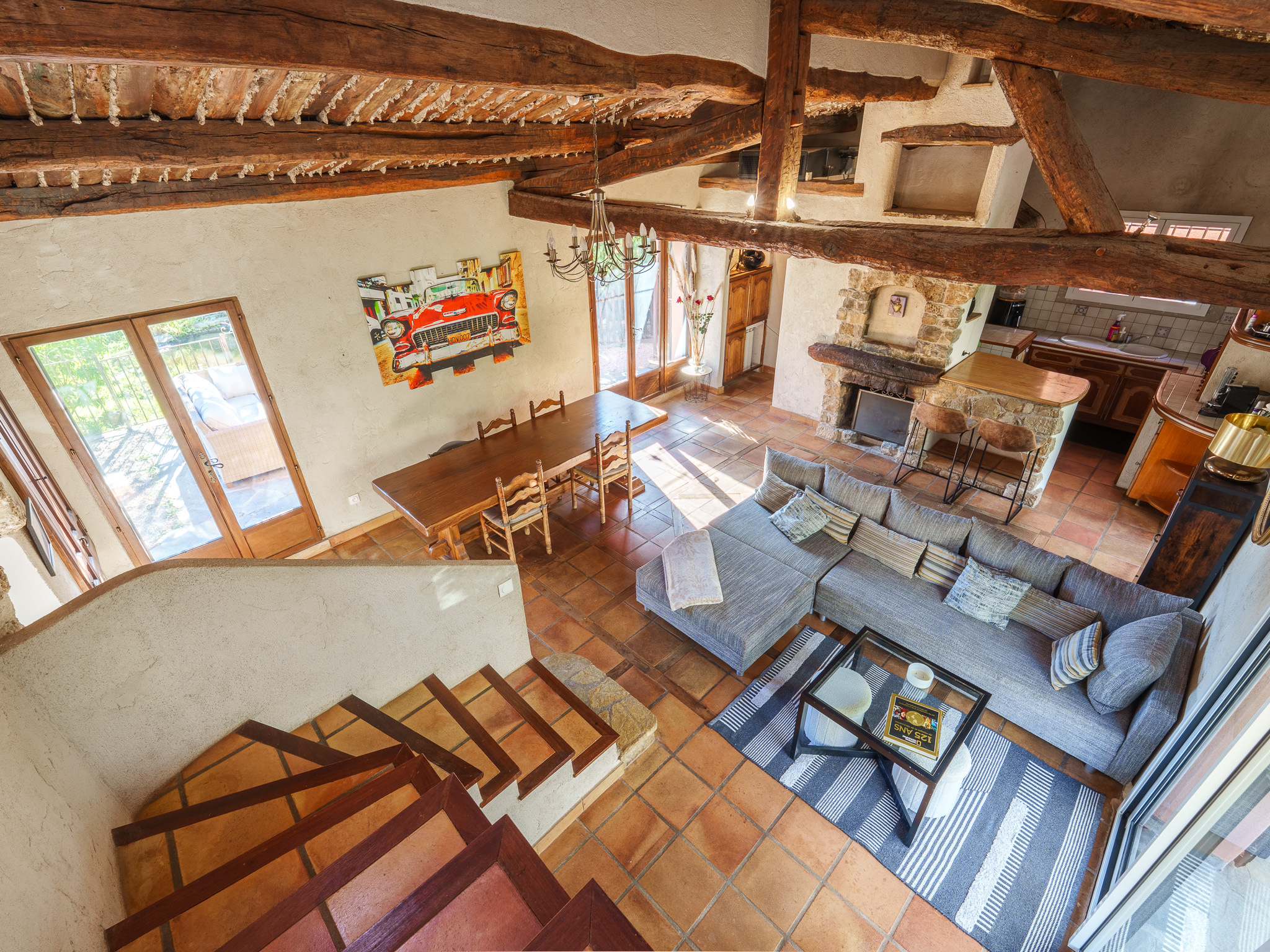 o Séjour avec cuisine ouverte, cheminée, climatisation