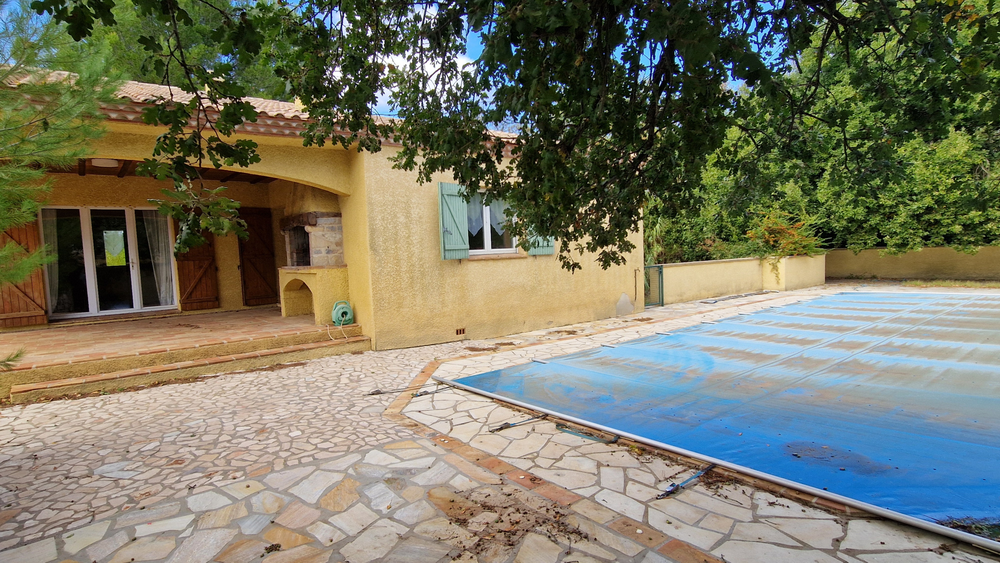 A vendre à moins de 5mn de GIGNAC, dans le ravissant village de POUZOLS - Nichée en fond d'impasse en limite de zone constructible et édifiée sur une grande parcelle de 1357m2 avec piscine : Grande villa traditionnelle de plain-pied de type 5 d'environ 147m2 habitables + sous-sol intégral avec grand garage, atelier, buanderie - L'habitation se composant: