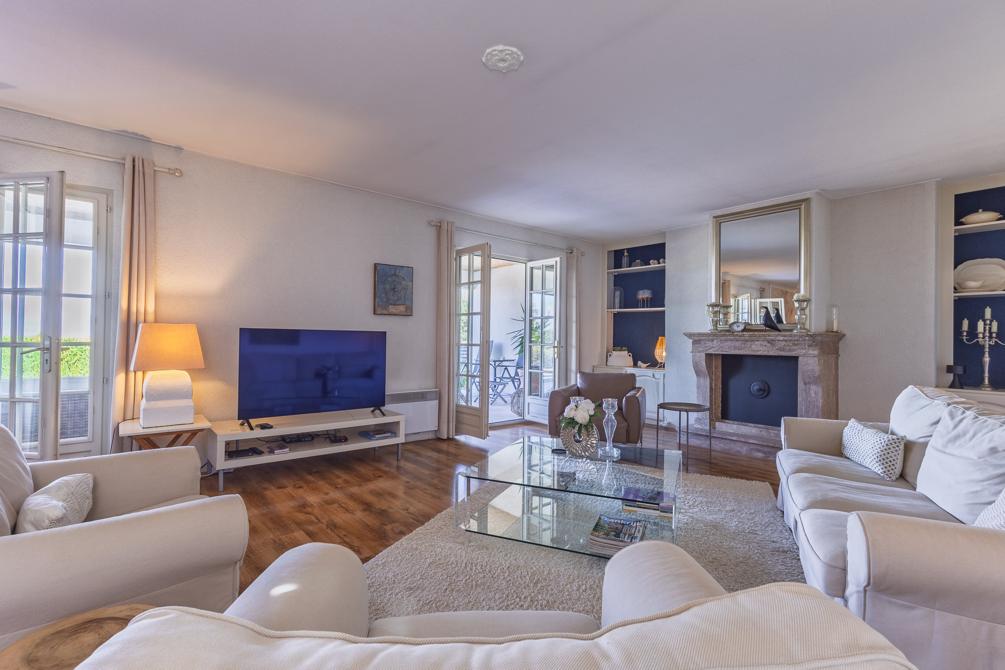 À l'extérieur, la propriété dispose de deux grandes terrasses à l'arrière de la maison, offrant une vue ouverte sur la campagne. Autour de la piscine, plusieurs espaces de détente ont été aménagés pour profiter du calme et du soleil.