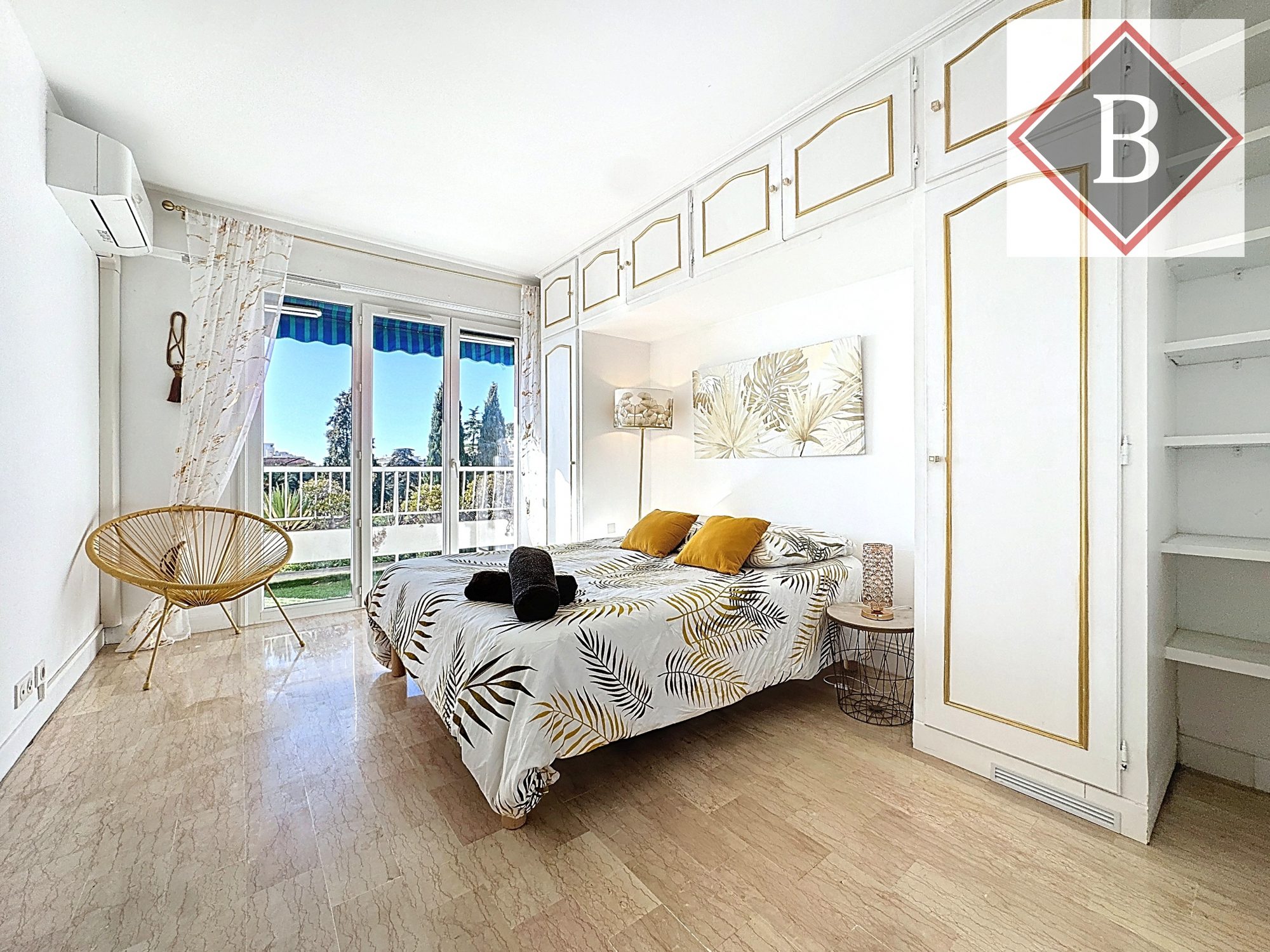 Rénové récemment il se compose d'une entrée, d'un lumineux salon / séjour / salle à manger exposée plein SUD ouvrant sur le balcon qui jouit d'une magnifique vue verdoyante ainsi qu'un petit aperçu île de Lérins , d'une spacieuse cuisine avec coin repas qui ouvre également sur la terrasse.