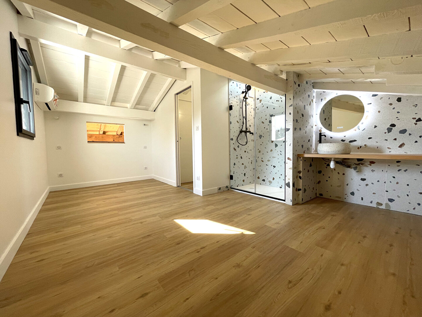 Elle comprend quatre chambres avec salles d'eau, dont deux en rez-de-chaussée et deux à l'étage sous la charpente apparente.