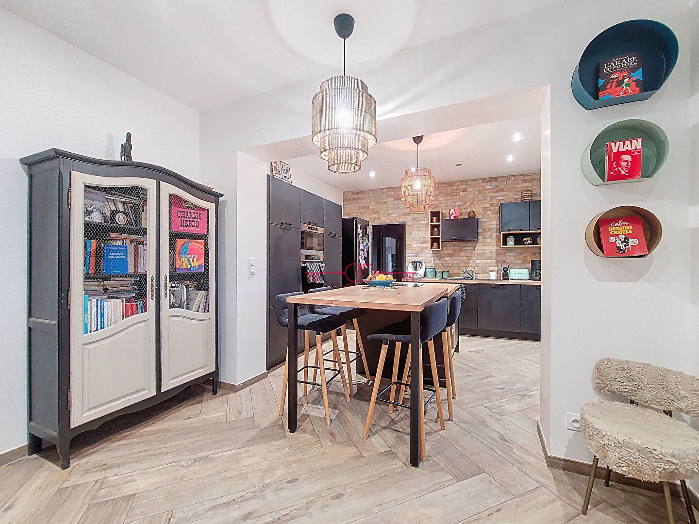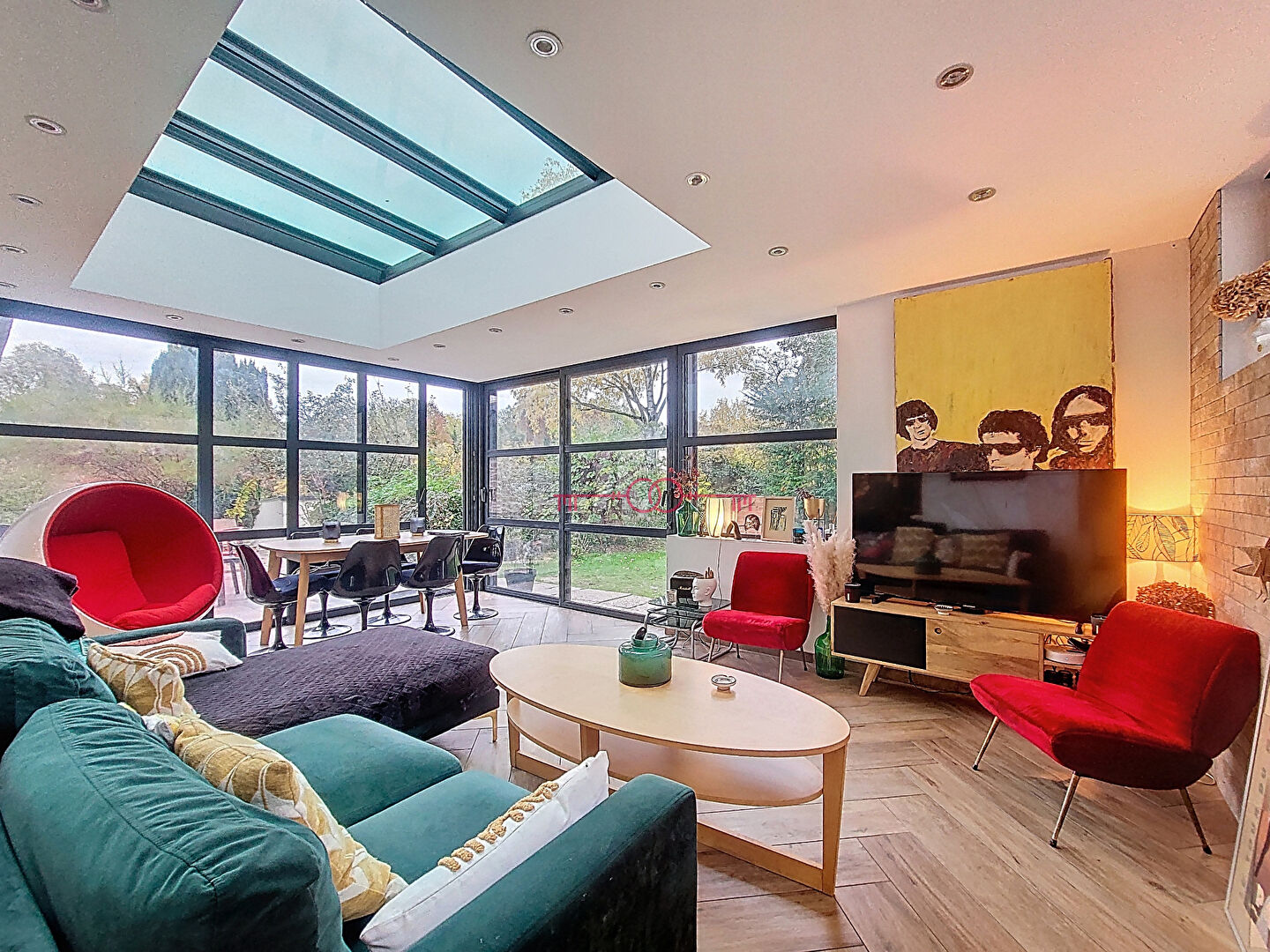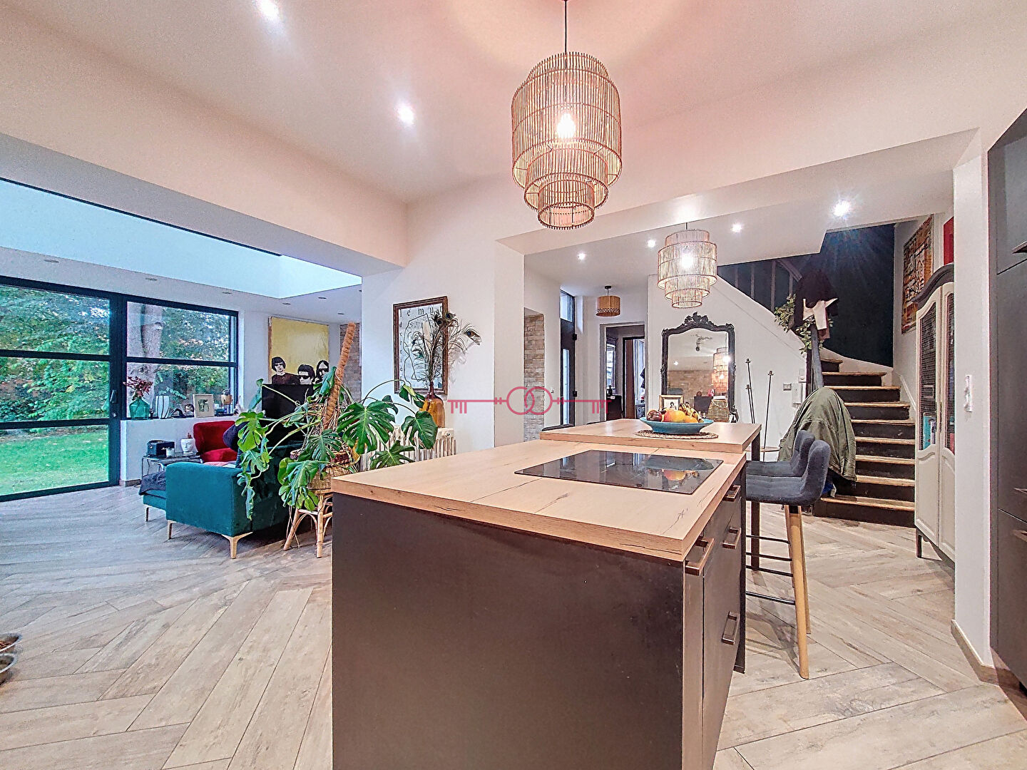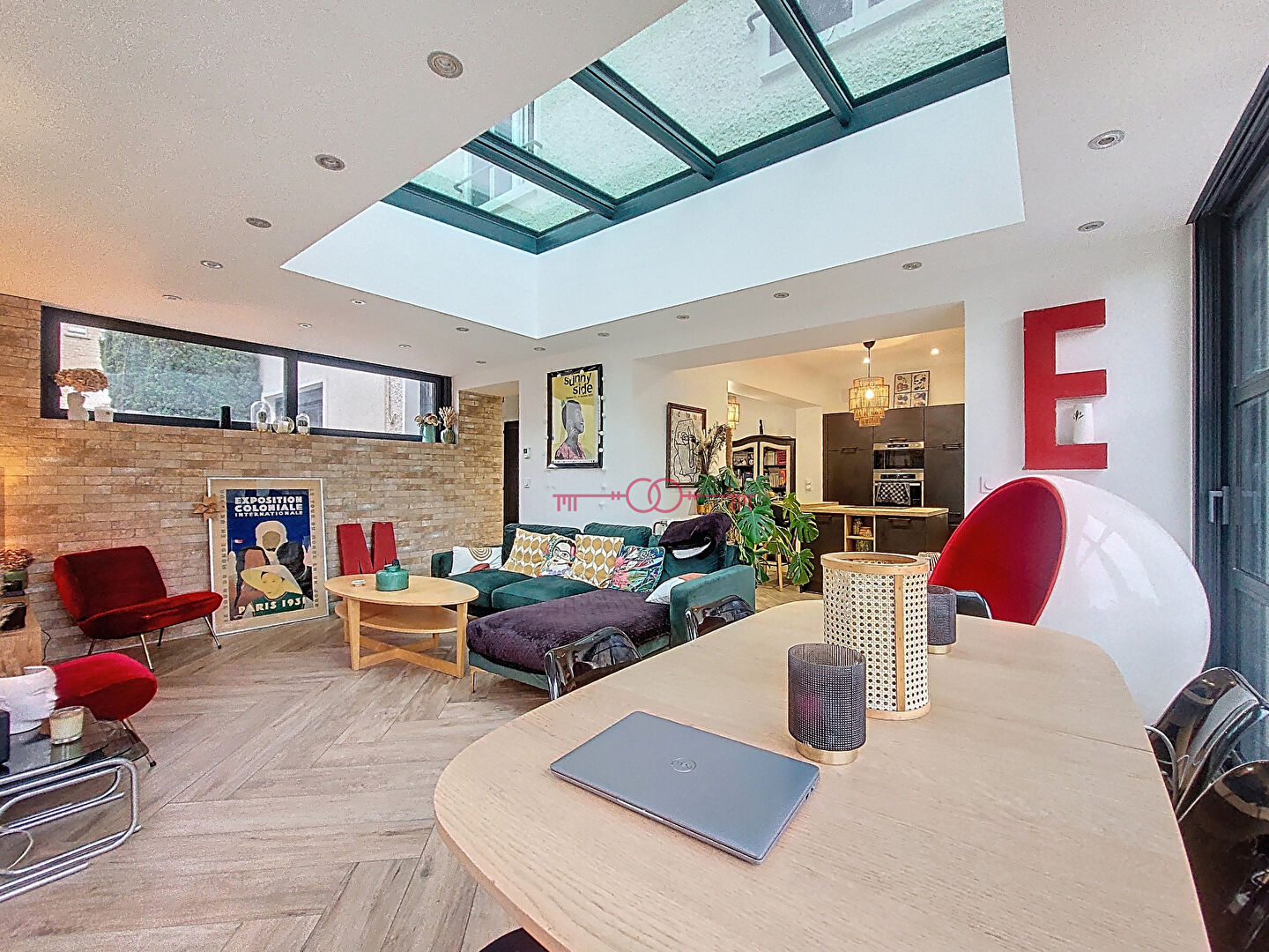 Une entrée dessert un vaste espace de vie composé de la cuisine et sa partie dînatoire, son espace véranda qui donne à cette maison des années 1900 son côté moderne et chaleureuse avec sa vue sur jardin.