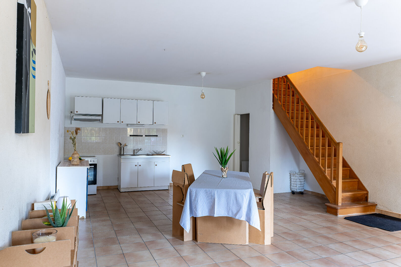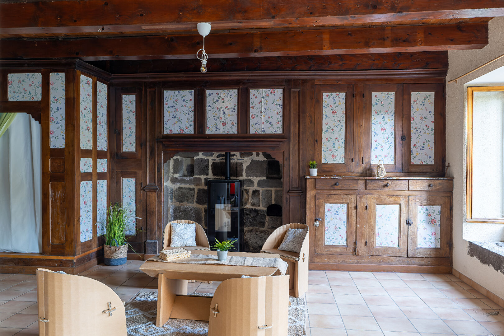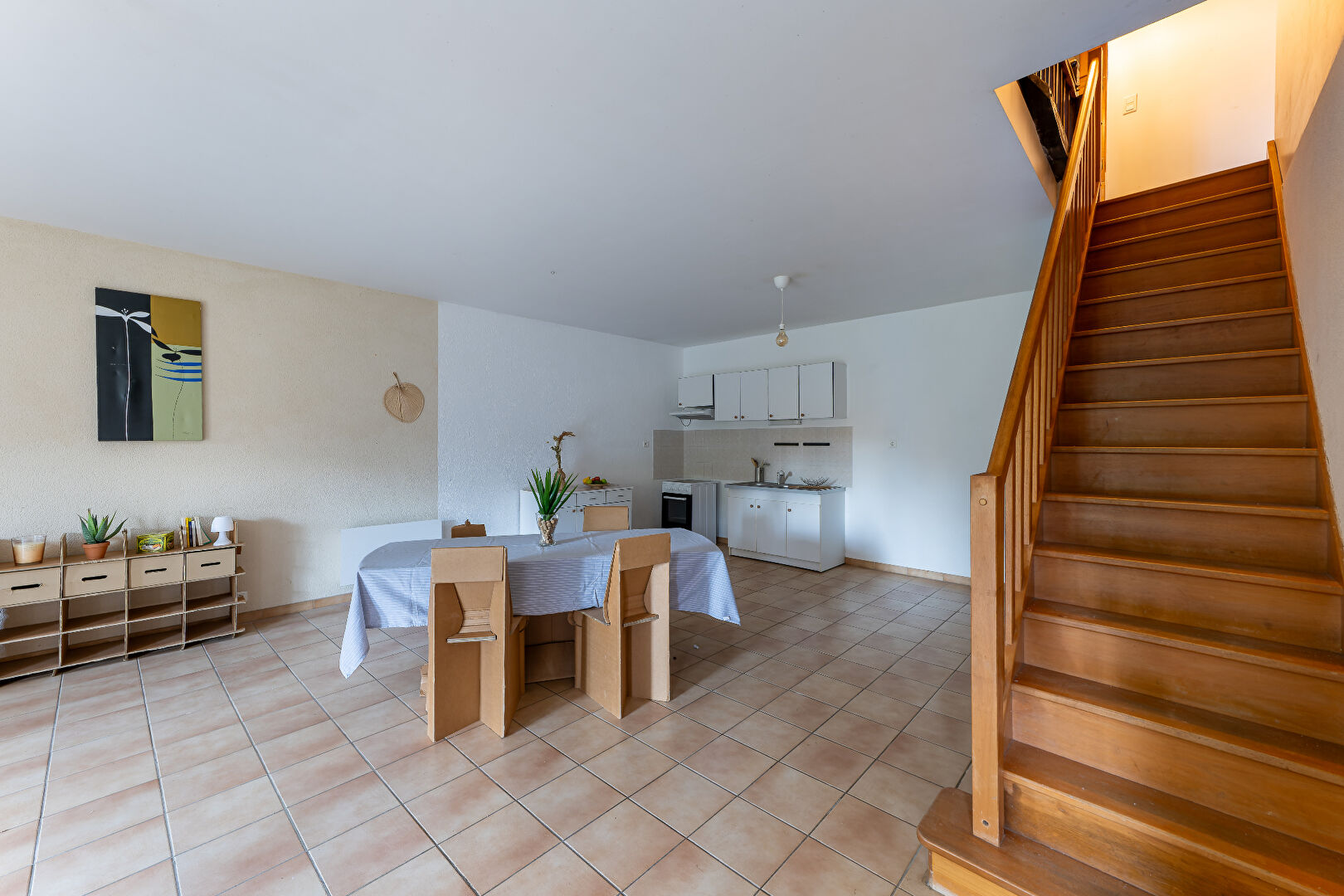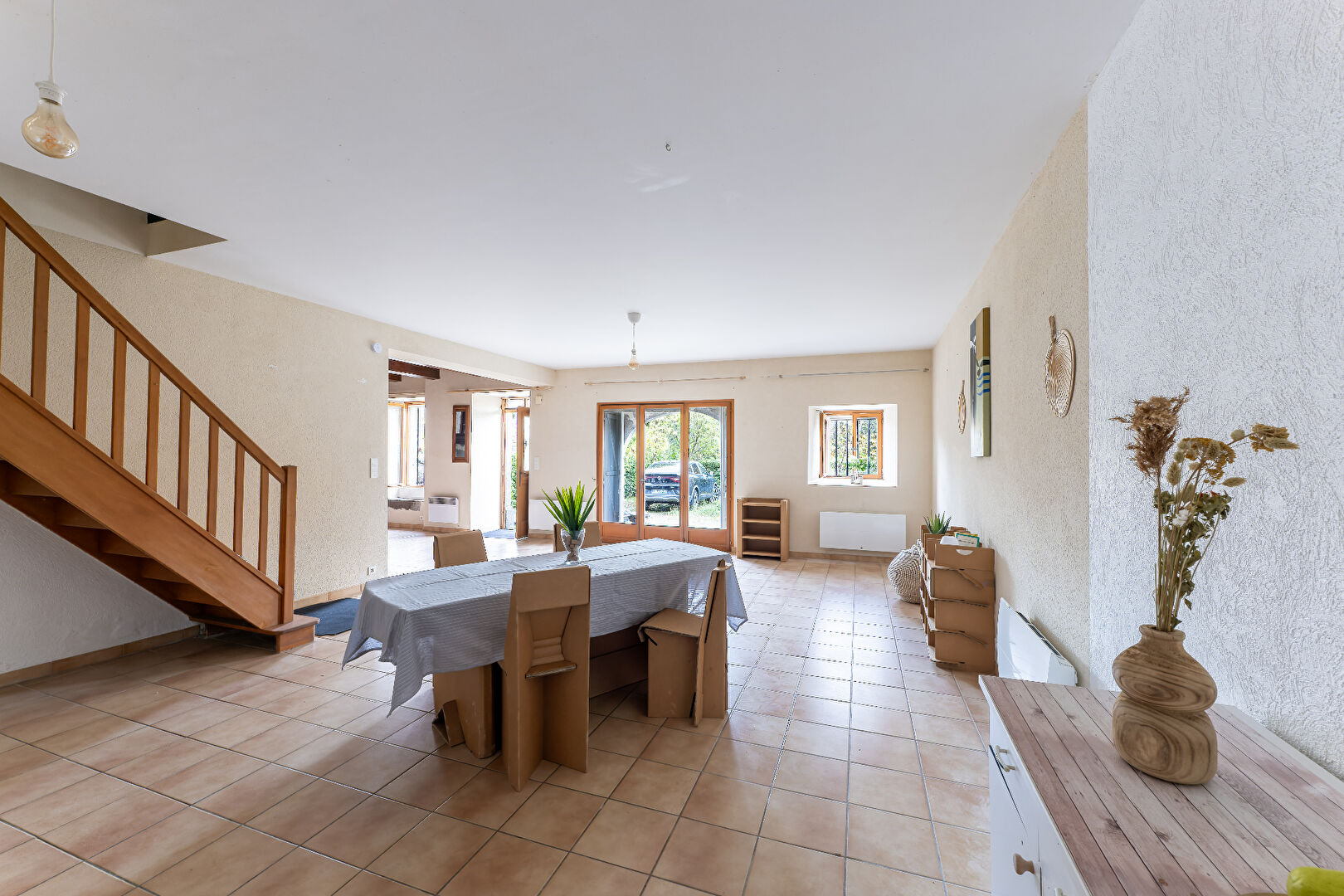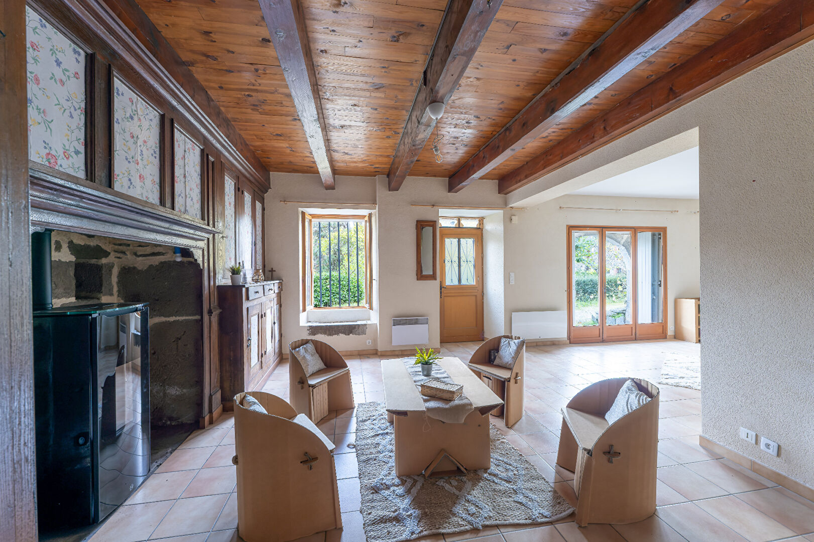 Elle comprend en rez-de-chaussée : une cuisine ouverte, séjour double avec son poêle neuf, un cellier et un wc.