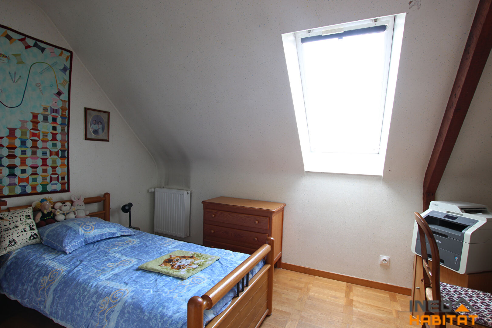 À l'étage, le palier distribue trois chambres, un bureau ainsi qu'une salle d'eau avec WC.