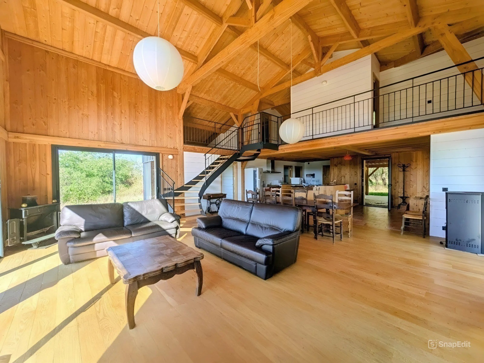 D?une superficie d?environ 190 m², elle offre une pièce de vie spacieuse et lumineuse avec toit cathédrale et charpente traditionnelle apparente, ouverte sur une grande terrasse en bois exposée plein sud.
