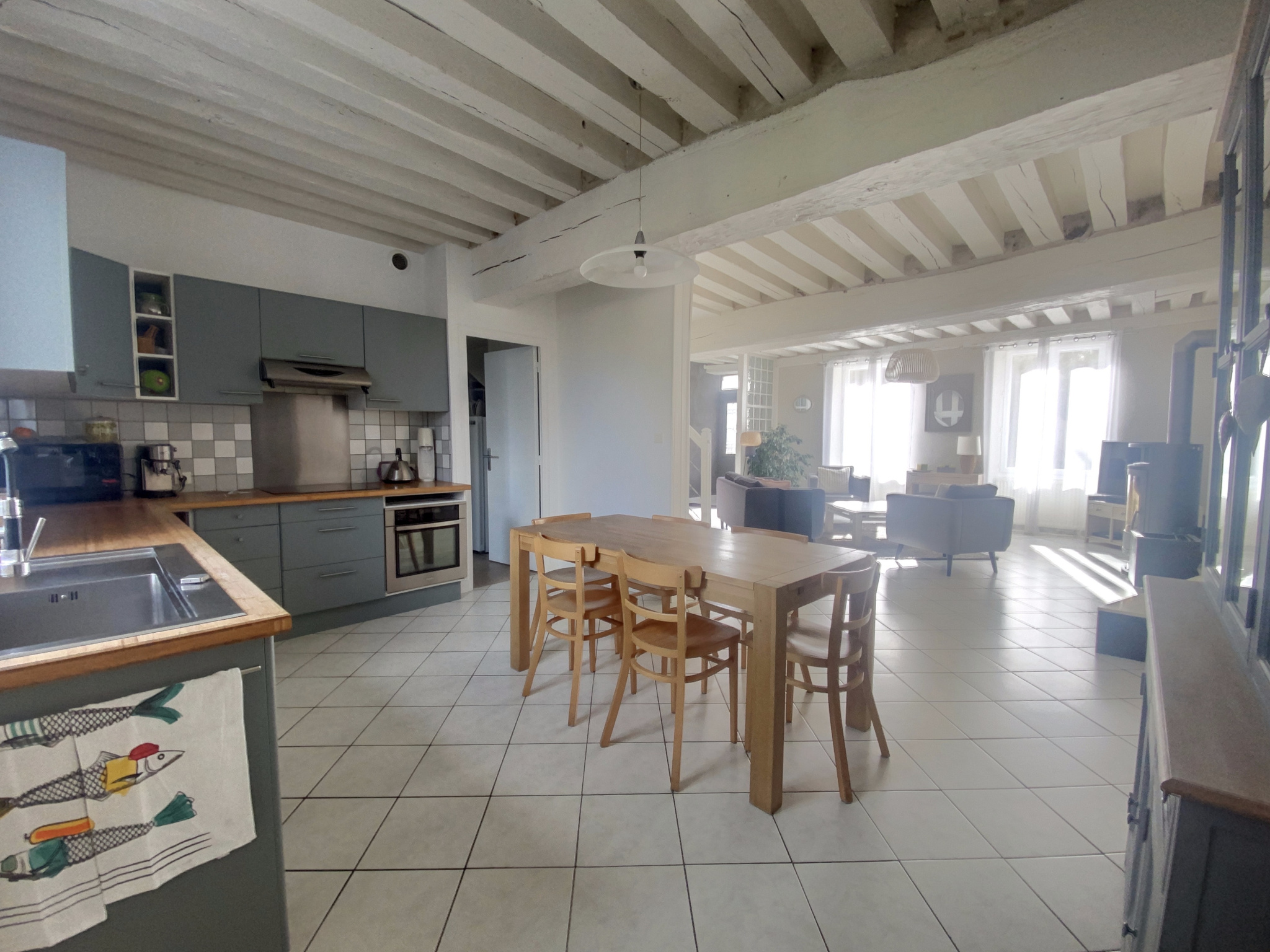 Au rez-de-chaussée, l'entrée s'ouvre sur une vaste pièce de vie traversante, chaleureuse, dotée d'un poêle à bois, de pierres et poutres apparentes, prolongée par une cuisine ouverte aménagée et équipée. Une arrière-cuisine, une buanderie, un débarras, des toilettes séparées et de nombreux rangements complètent ce niveau, offrant une organisation fonctionnelle et un confort quotidien.