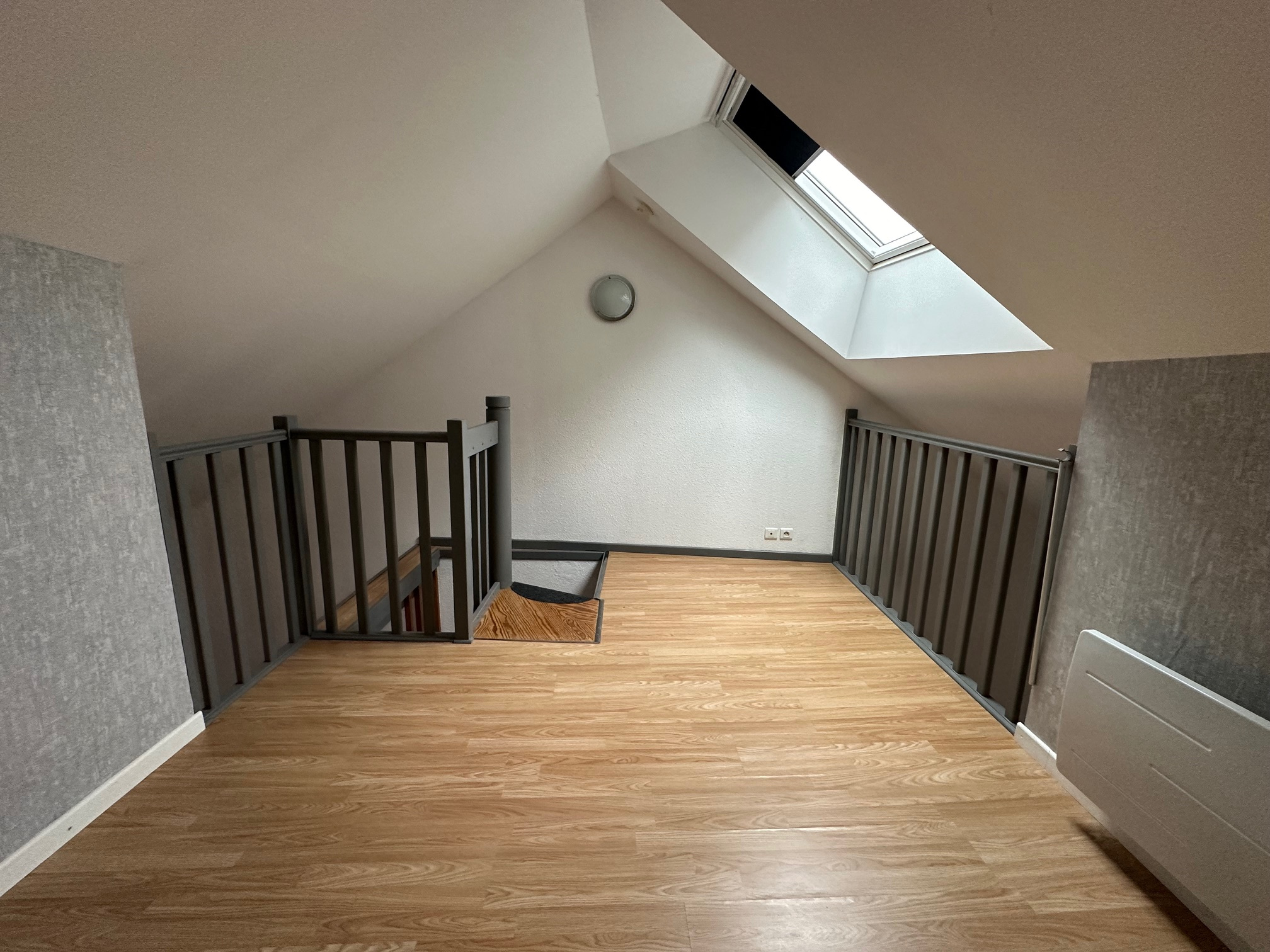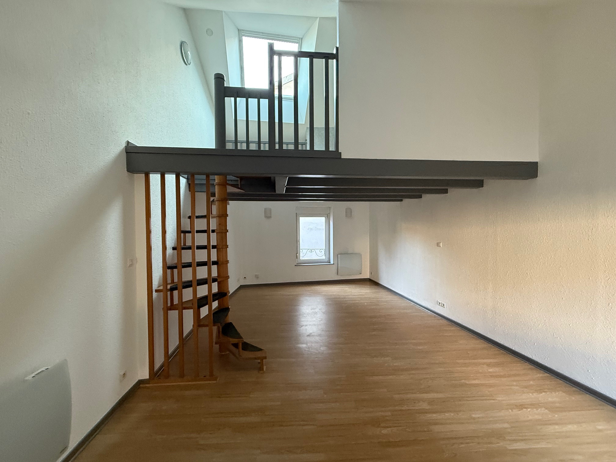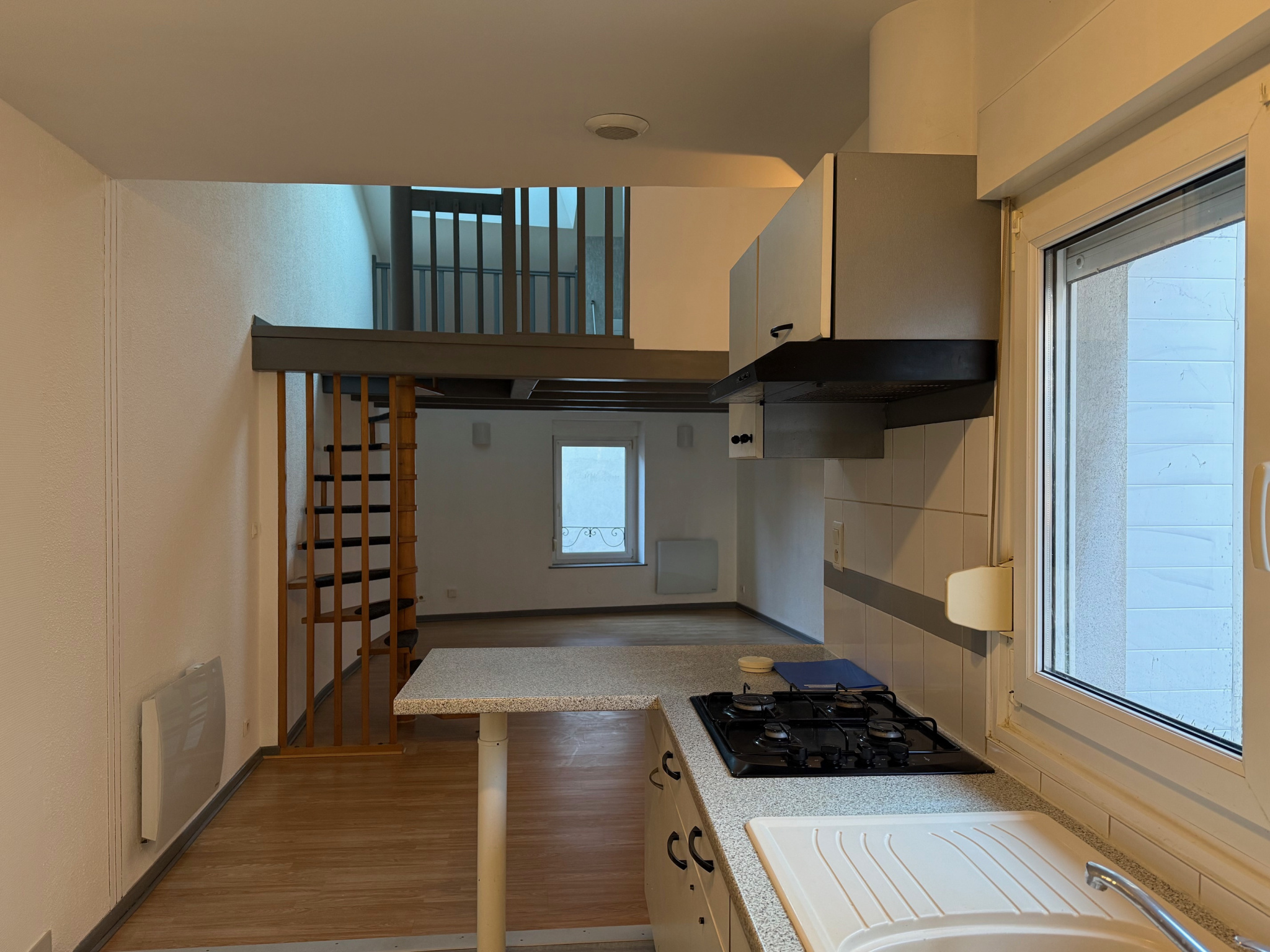 Appartement en duplex situé au 2ème étage comprenant : entrée, salle de douche avec wc, cuisine semi-équipée ouverte sur le salon/séjour. À l'étage : mezzanine (chambre).