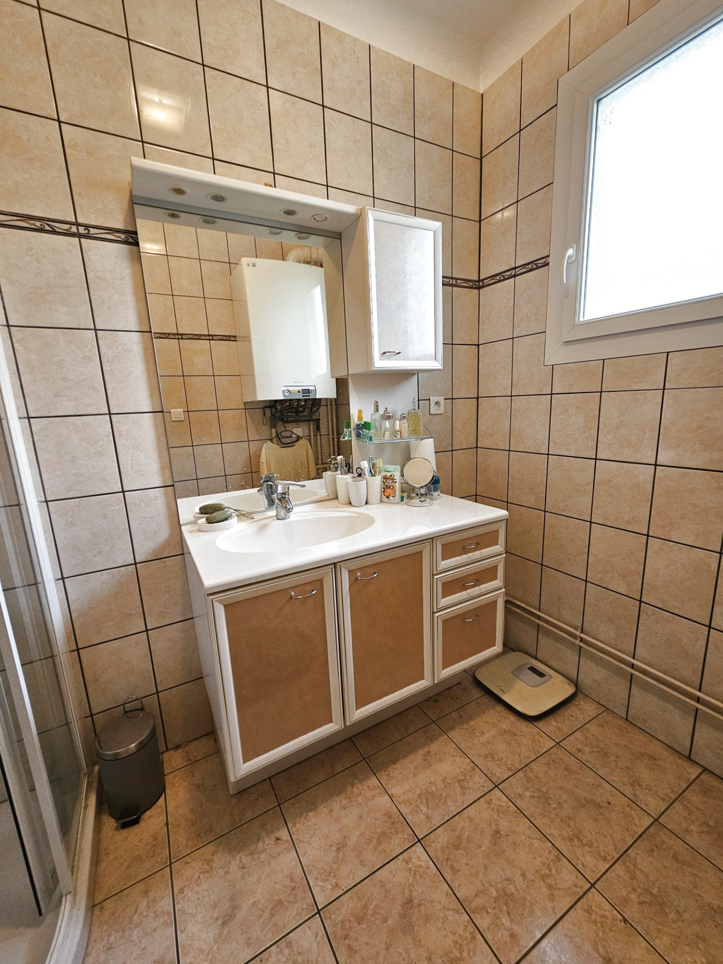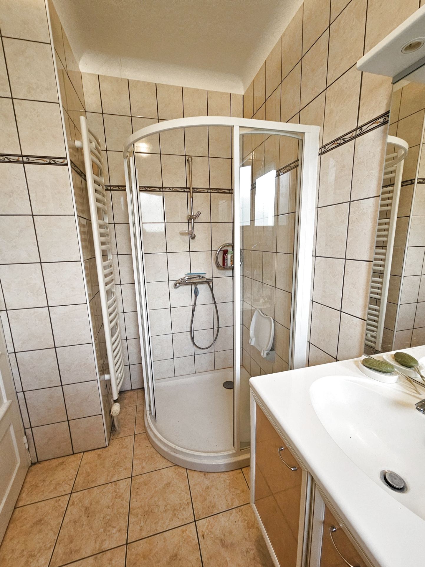 L'habitation de 92 m2 au 1er étage est en très bon état. Elle comprend un grand dégagement donnant accès à un balcon, une cuisine aménagée et équipée, un séjour salon, 2 grandes chambres, une salle d'eau, un wc et une buianderie.