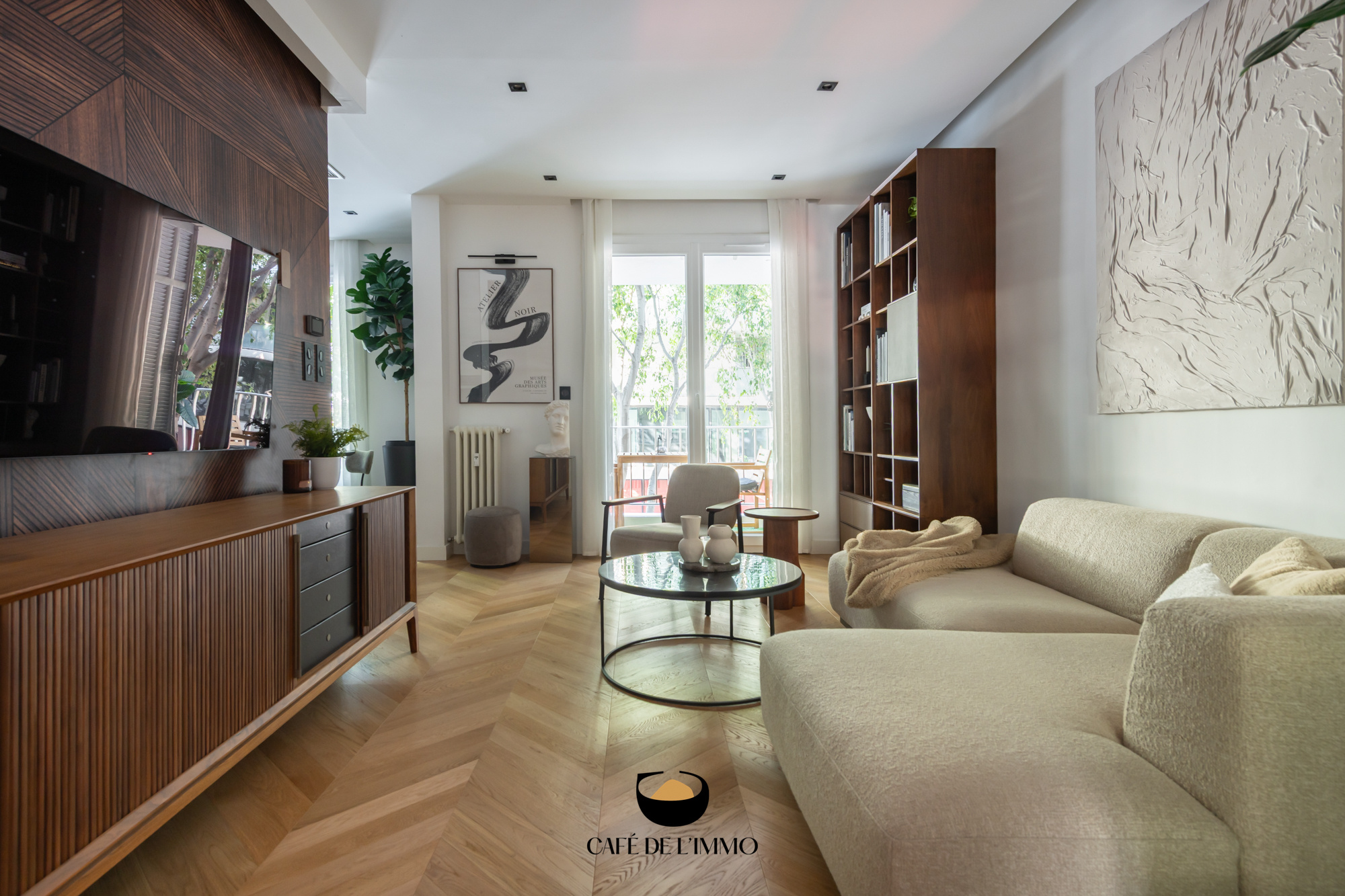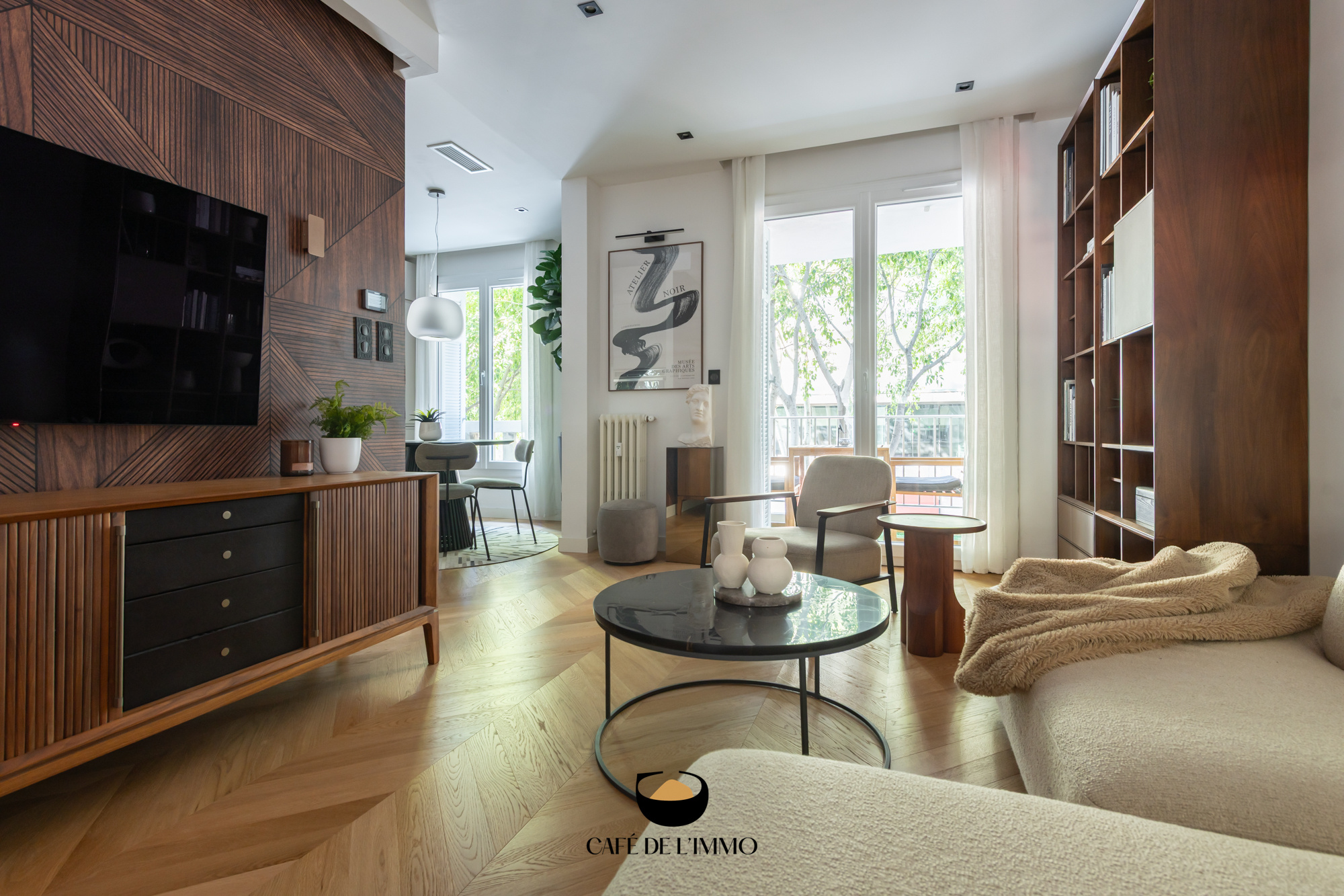Traversant Est-Ouest, il dispose de deux extérieurs qui prolongent l'espace de vie : à l'Est, un balcon donnant sur cour et sur les arbres, parfait pour un café au lever du soleil à l'abri du tumulte ; à l'Ouest, un deuxième espace extérieur.