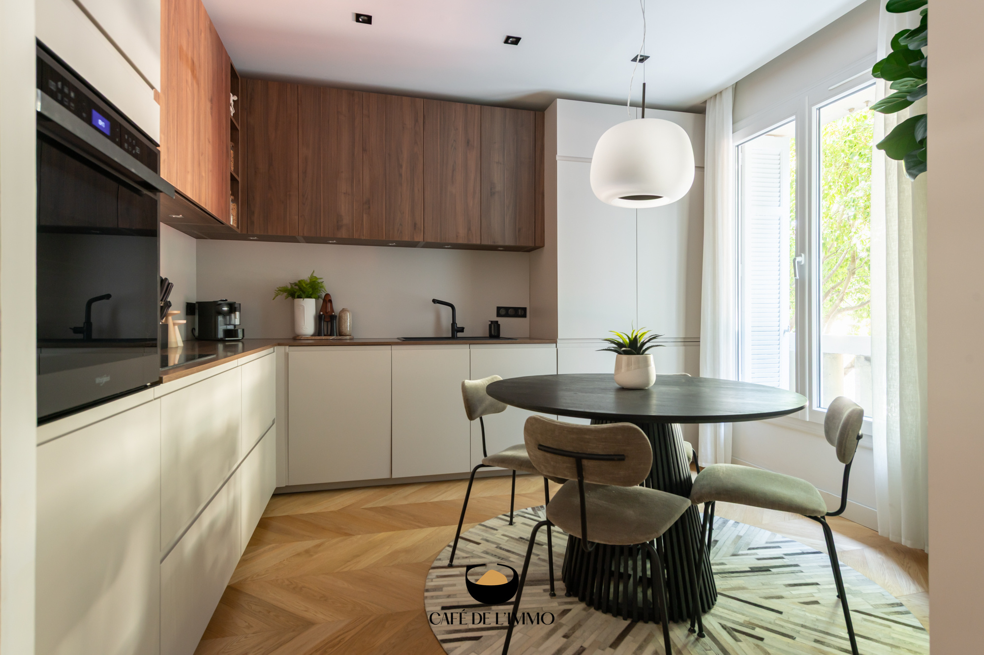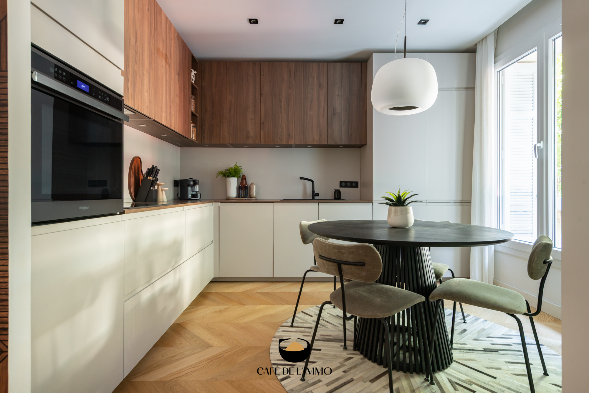 La cuisine, entièrement équipée et intégrée, offre un bel espace salle à manger chaleureux et convivial.
