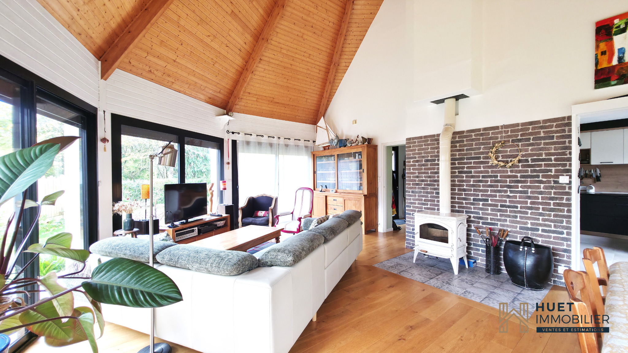 Sous son magnifique toit cathédrale, la pièce de vie baignée de lumière s'ouvre sur le jardin grâce à de larges baies vitrées offrant une vue panoramique sur la nature environnante.