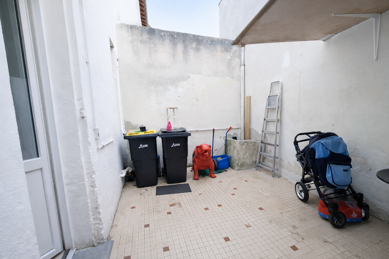 Le rez-de-chaussée se compose d'un salon avec cuisine ouverte, offrant un espace de vie fonctionnel et lumineux, avec accès direct à une cour privative pleine de charme. Un WC complète ce niveau.
