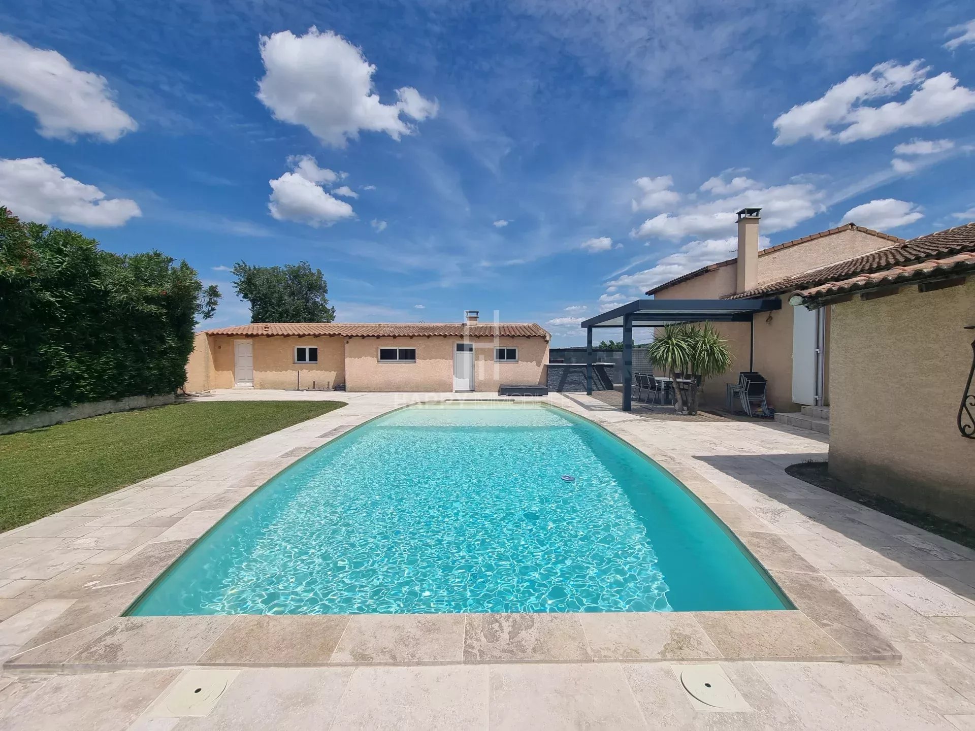 Sans oublier sa superbe piscine 10x5m avec plage immergée, ses nombreuses terrasses pour profiter des belles journées dont une ombragée d'une pergola bioclimatique, son jardin soigneusement aménagé et ses prestations de qualité (climatisation réversible gainée en plafond, cheminée insert, alarme, portail électrique, arrosage automatique avec eau du forage, 2 prises pour...