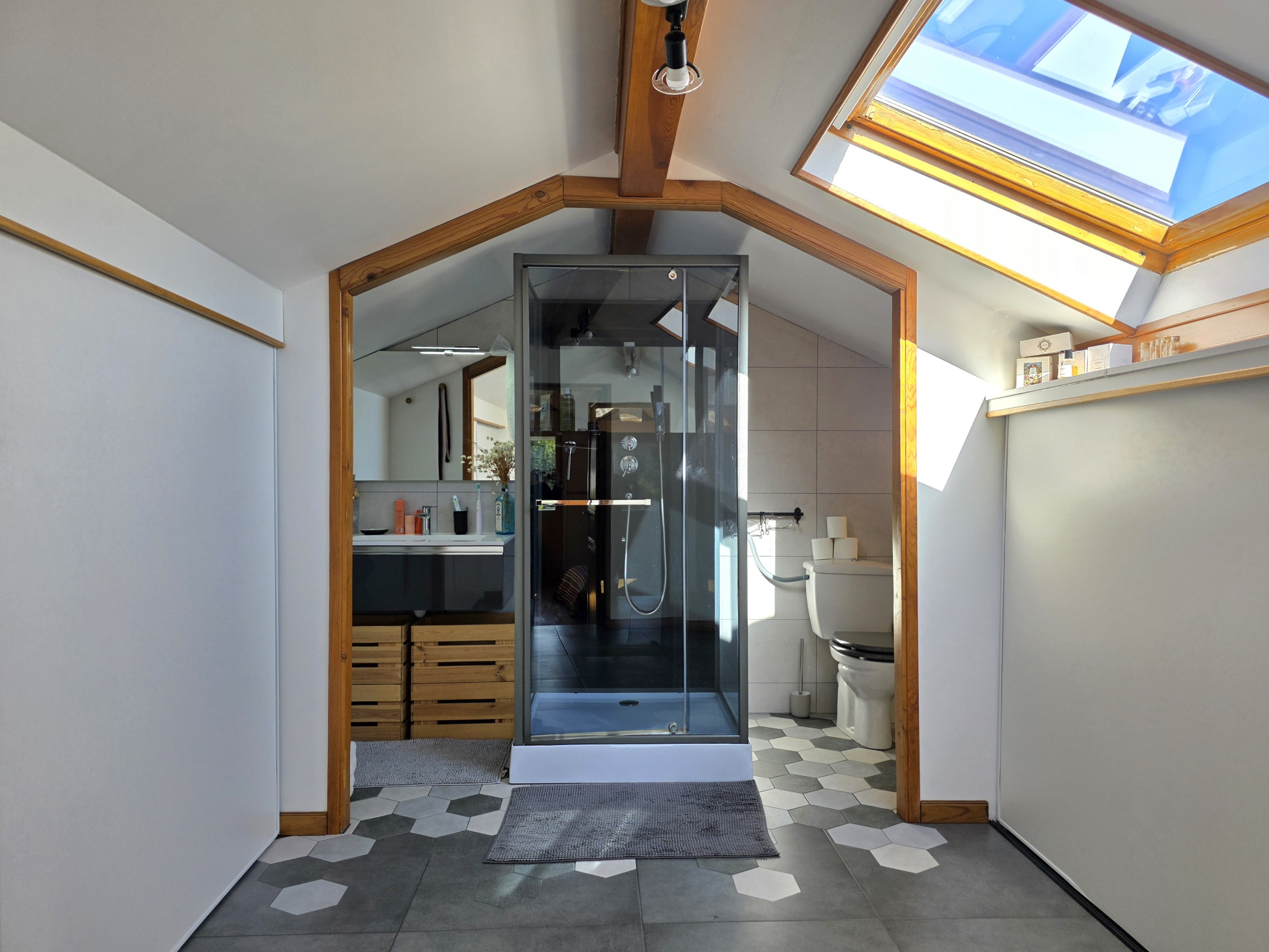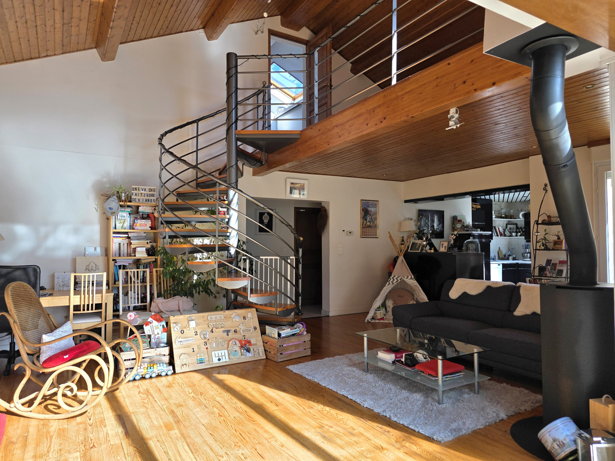 À l'étage supérieur : une mezzanine parentale de 26 m2 comprenant espace nuit, dressing et salle d'eau privative (douche et WC).
