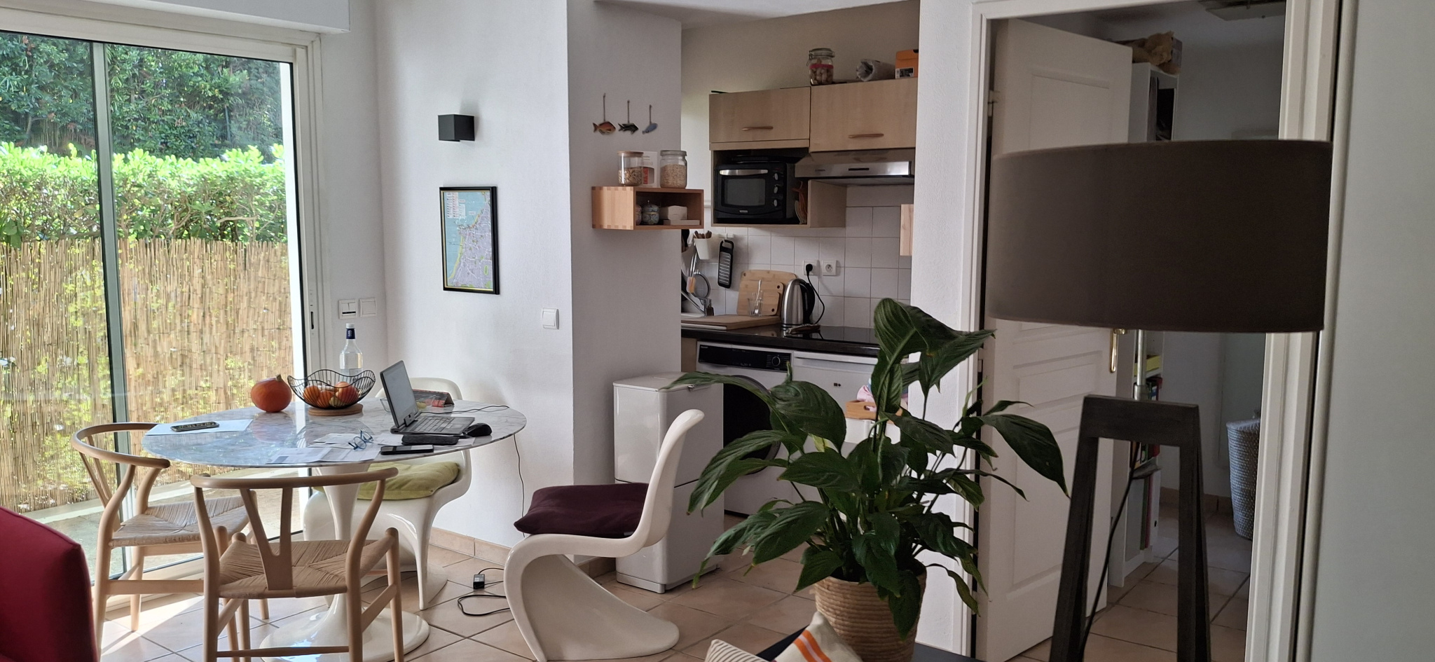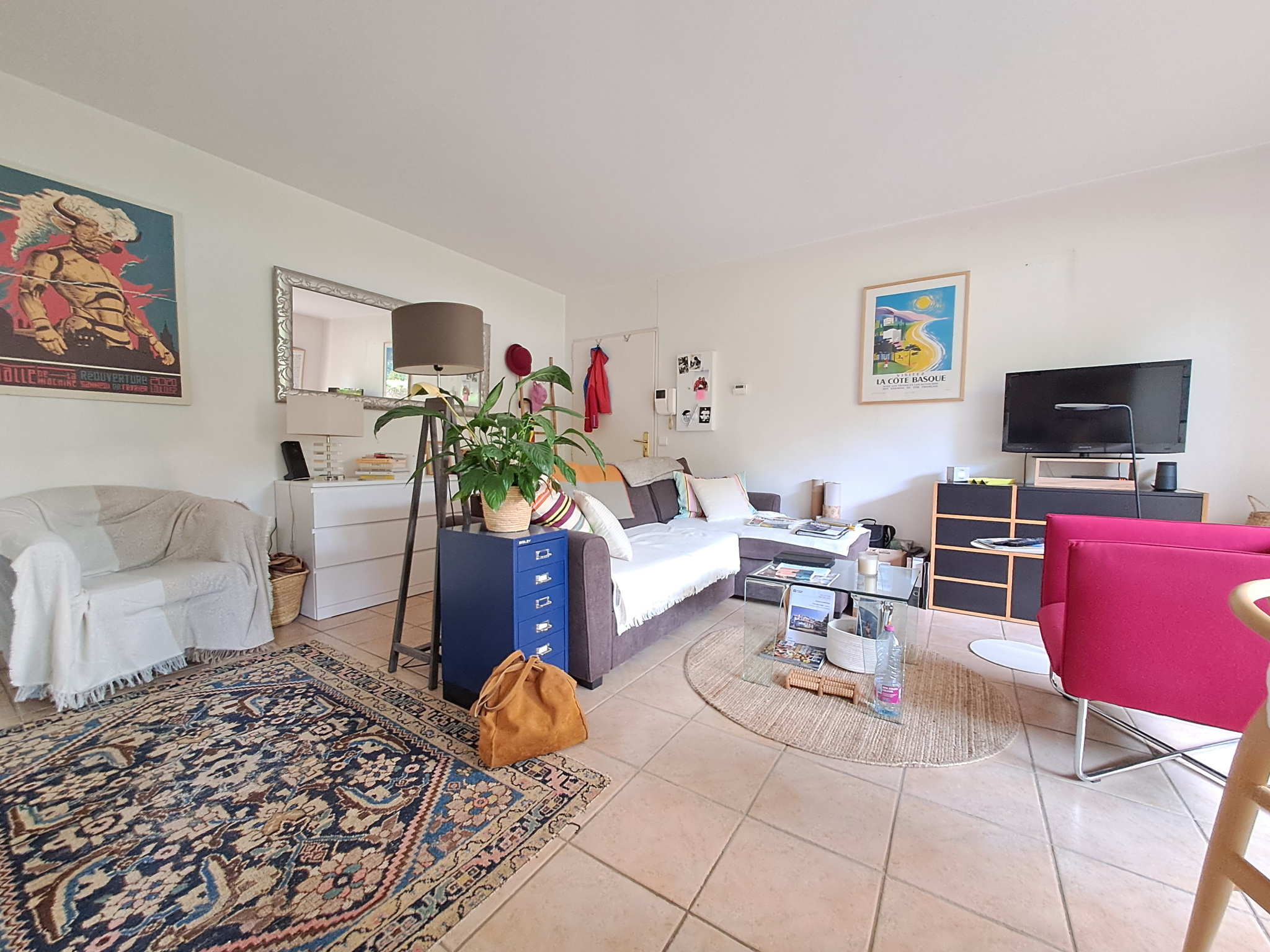 Biarritz, dans une Résidence de standing, entre Saint-Charles et Larochefoucaud, appartement de 2 pièces situé en rez-de-chaussée et comprenant : une entrée sur séjour avec cuisine ouverte, un dégagement avec placards, une chambre avec placard, une salle de bains et un w.c.