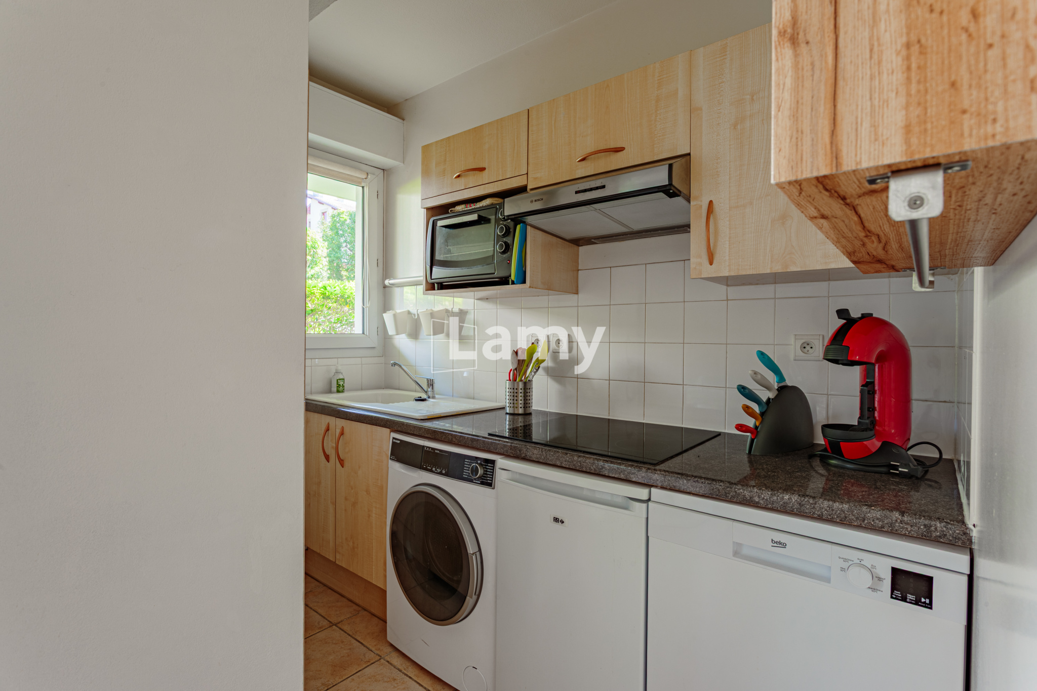 Biarritz, dans une Résidence de standing, entre Saint-Charles et Larochefoucaud, appartement de 2 pièces situé en rez-de-chaussée et comprenant : une entrée sur séjour avec cuisine ouverte meublée et équipée, un dégagement avec placards, une chambre avec placard, une salle de bains et un w.c.
