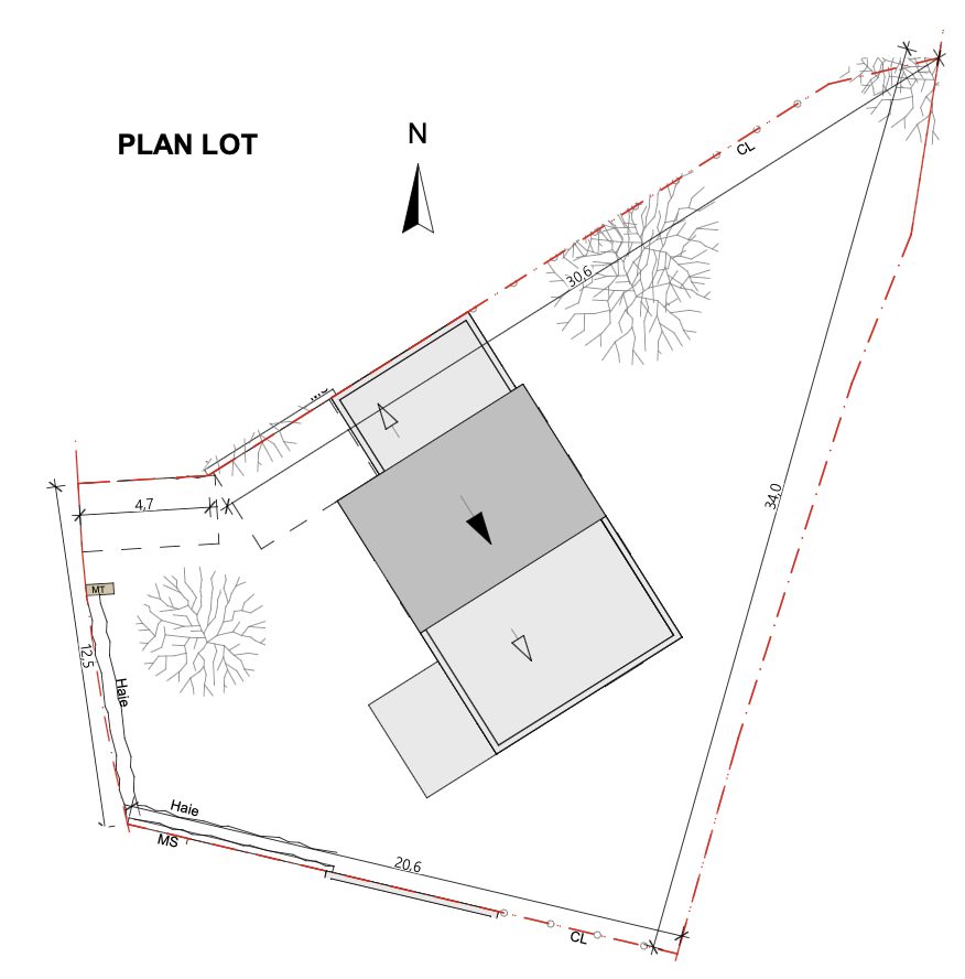 - Au rez de chaussée : Séjour 35m2, Chambre 12m2, salle d'eau, wc séparés, cellier, entrée, placards, terrasse, garage, jardin