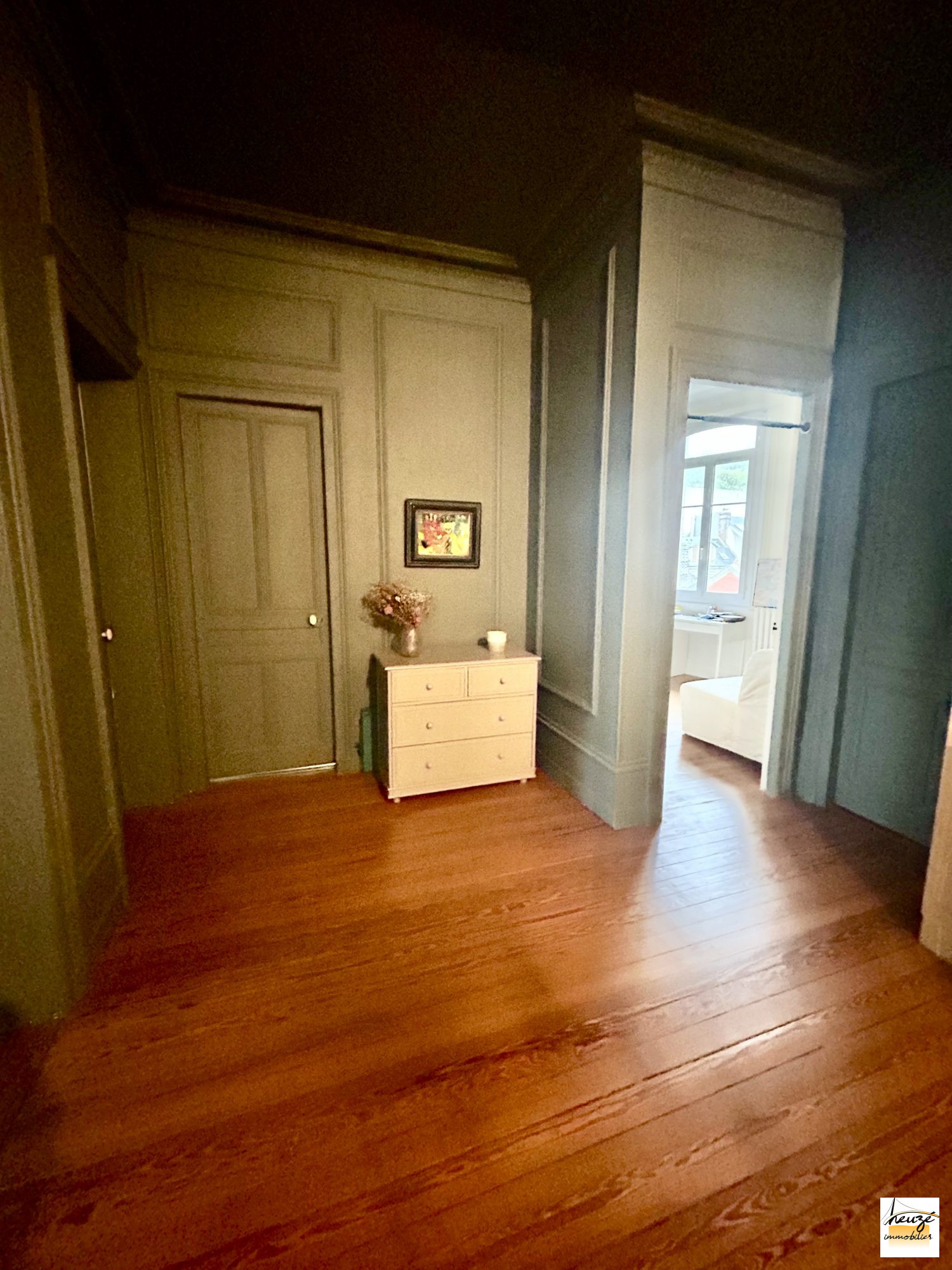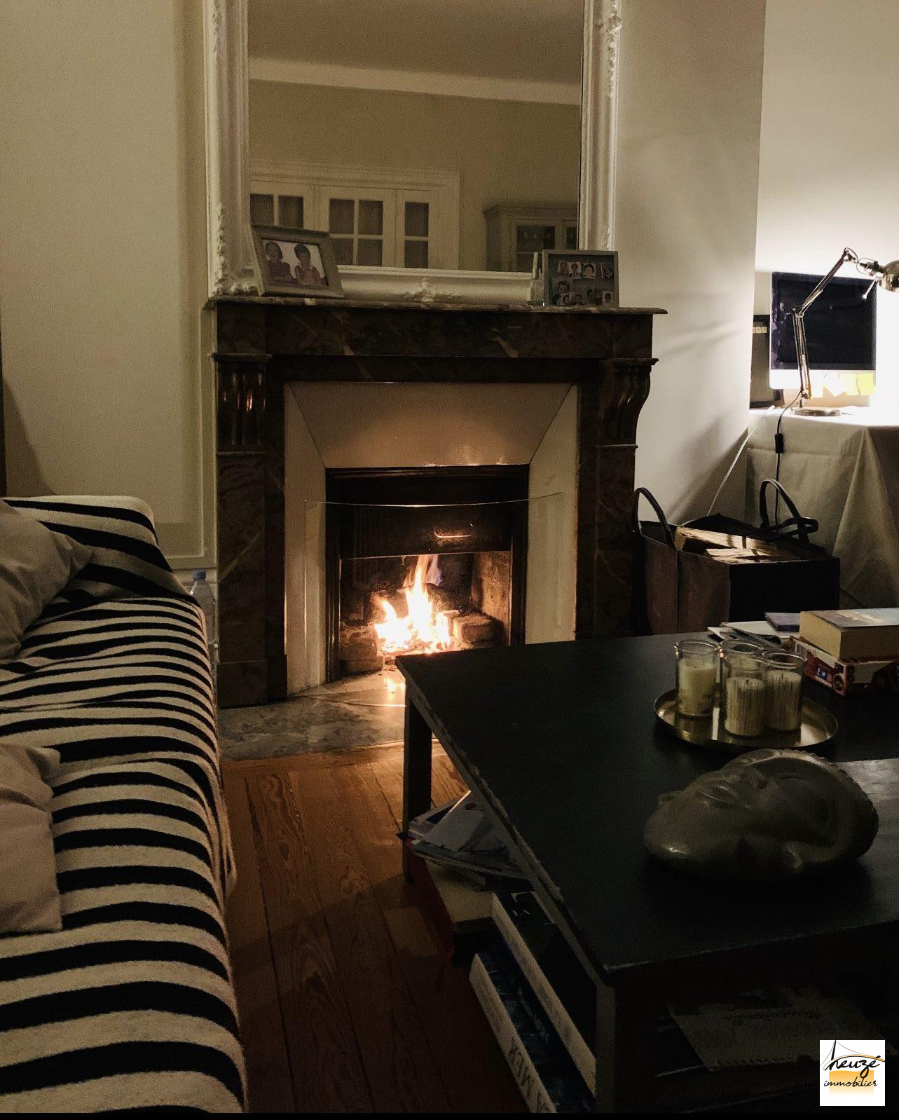Grande salle de réception avec cheminée en marbre et beaux parquet.