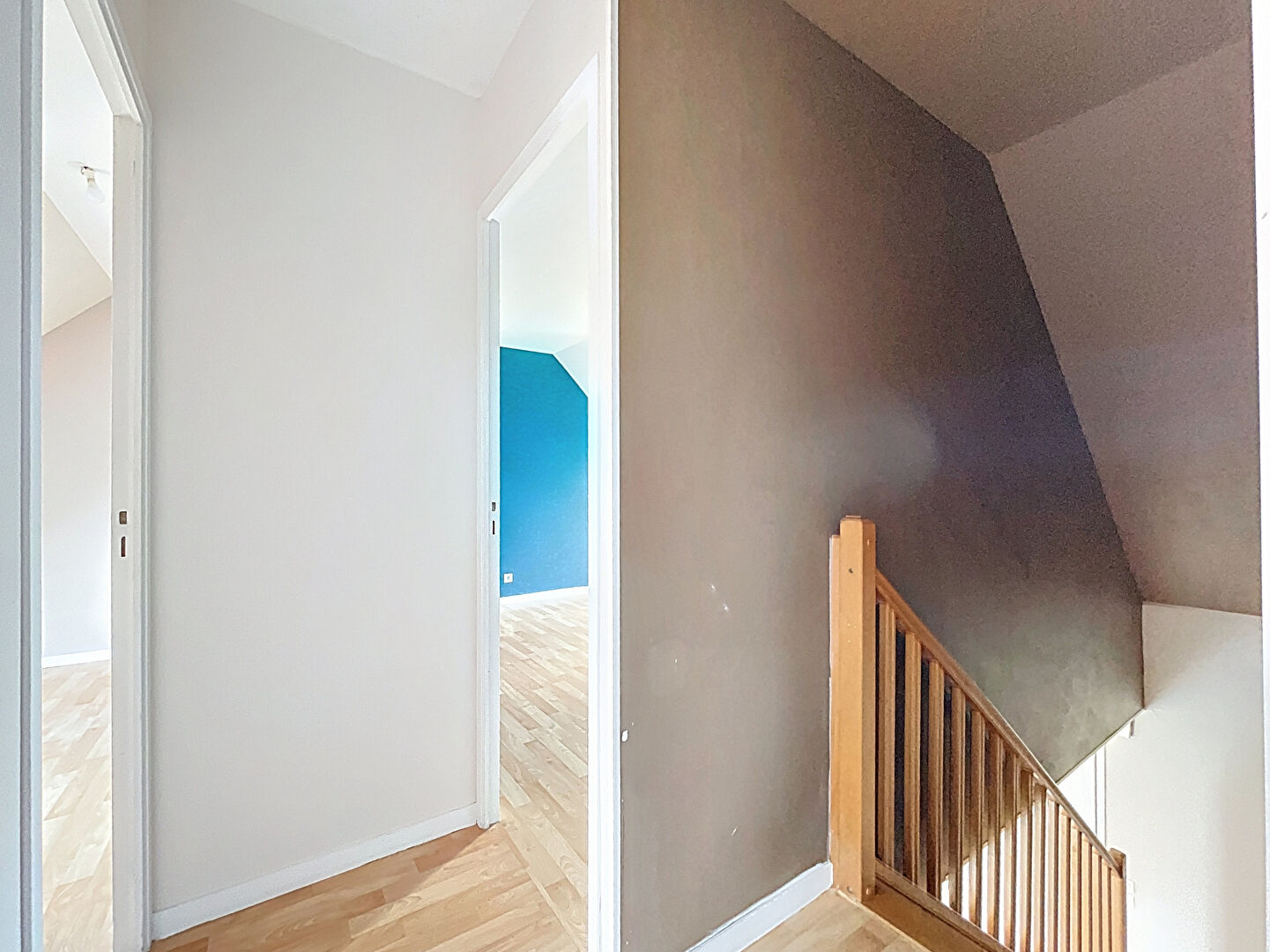 À l'étage, le palier dessert 3 chambres, un grenier, une salle de bains et un WC indépendant. Garage attenant. Terrain de 570m² et cour de stationnement.