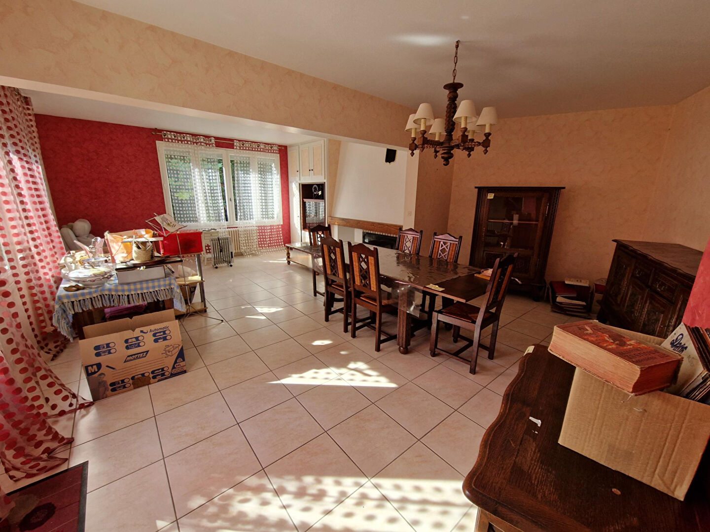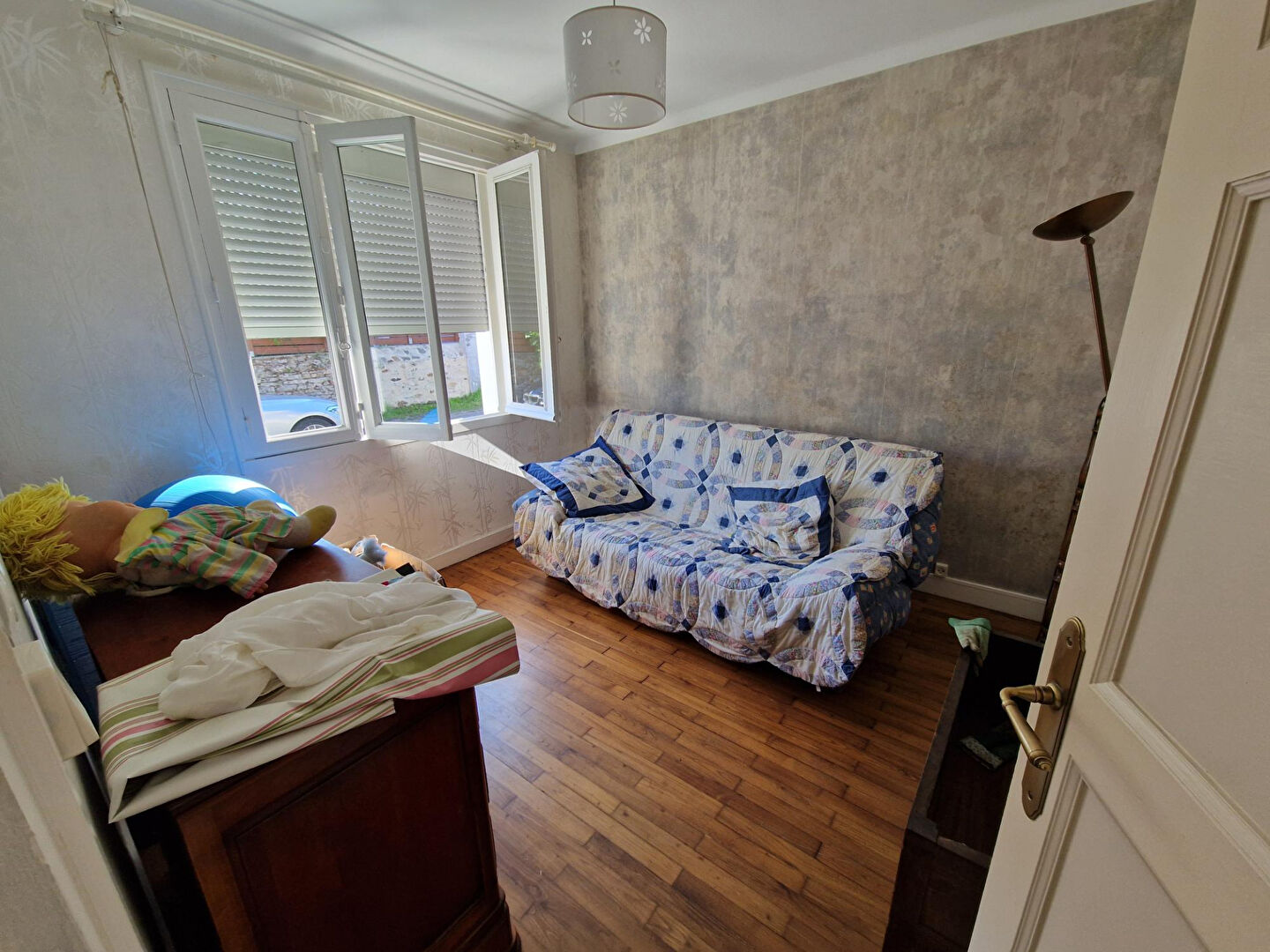 Maison de plain pied comprenant une cuisine, une pièce de vie avec cheminée insert, trois chambres, une salle d'eau, un WC indépendant et une buanderie.