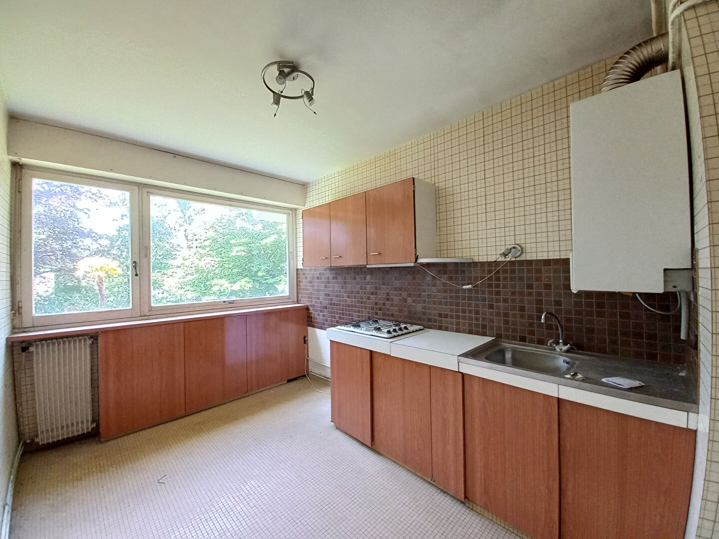 Dans un petit collectif, au coeur d'un environnement verdoyant et calme, vaste appartement de type 5 de 100m² à rénover offrant une belle pièce de vie lumineuse, cuisine indépendante, 3 chambres, cave et parking sous-terrain sécurisé. Prévoir travaux !