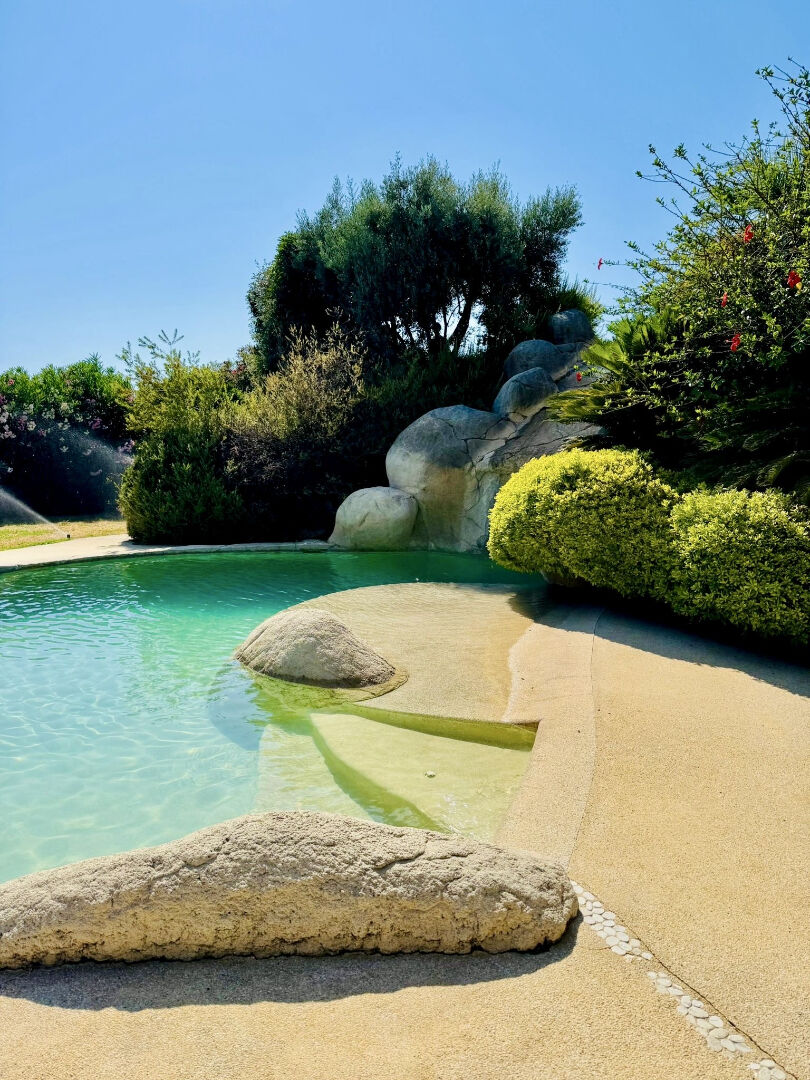 À l'extèrieur , une magnifique terrasse couverte, un grand espace gazonnéeavec son bassin organique qui descend en cascade sur la piscine du niveau inférieur.