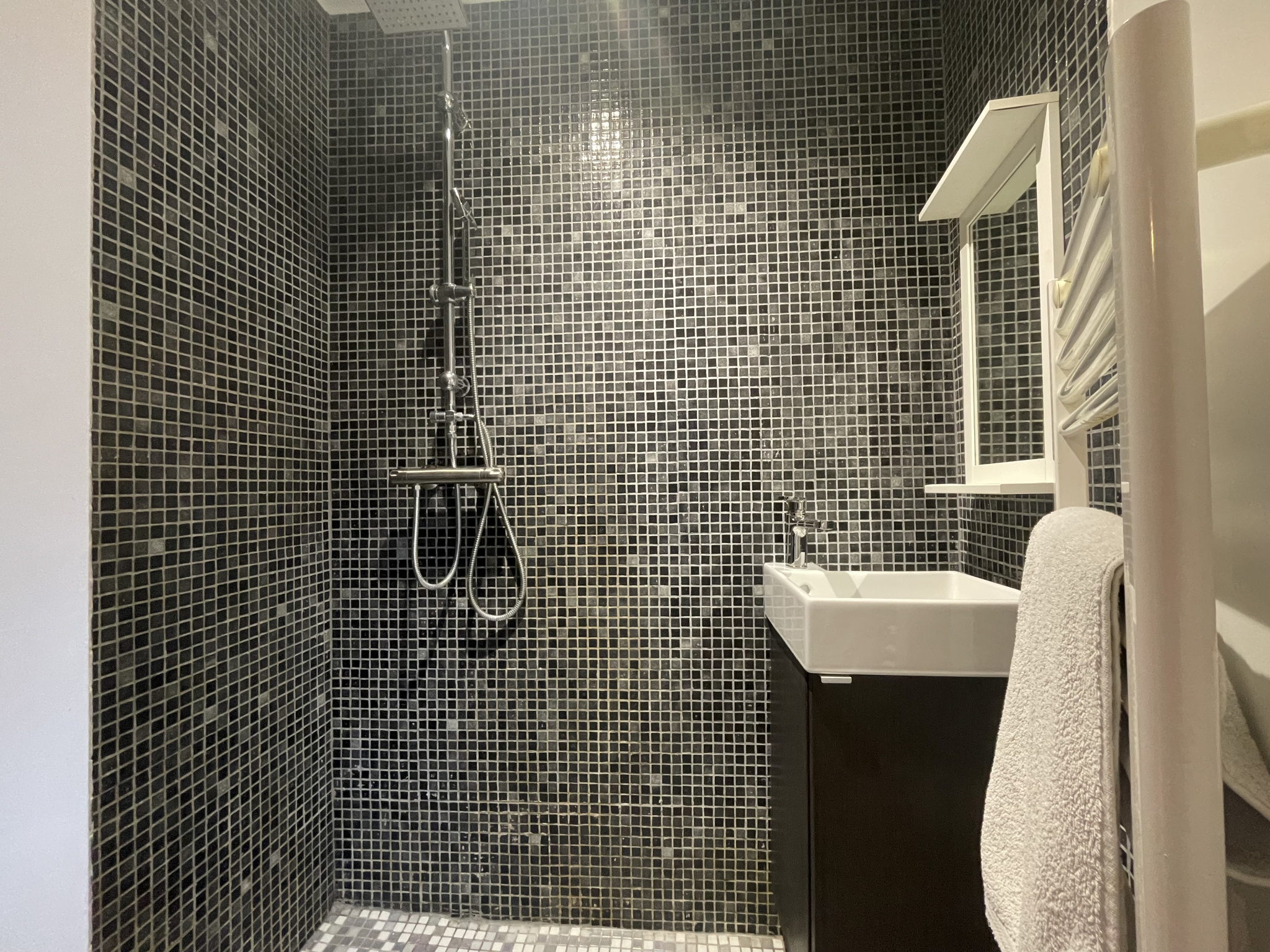 Il se compose d'un grand séjour avec cuisine ouverte entièrement équipée, de deux chambres, chacune avec sa salle d'eau privative et de toilettes séparées. Vous profiterez également d'une buanderie, d'une cave voutée ainsi que d'un grand garage.