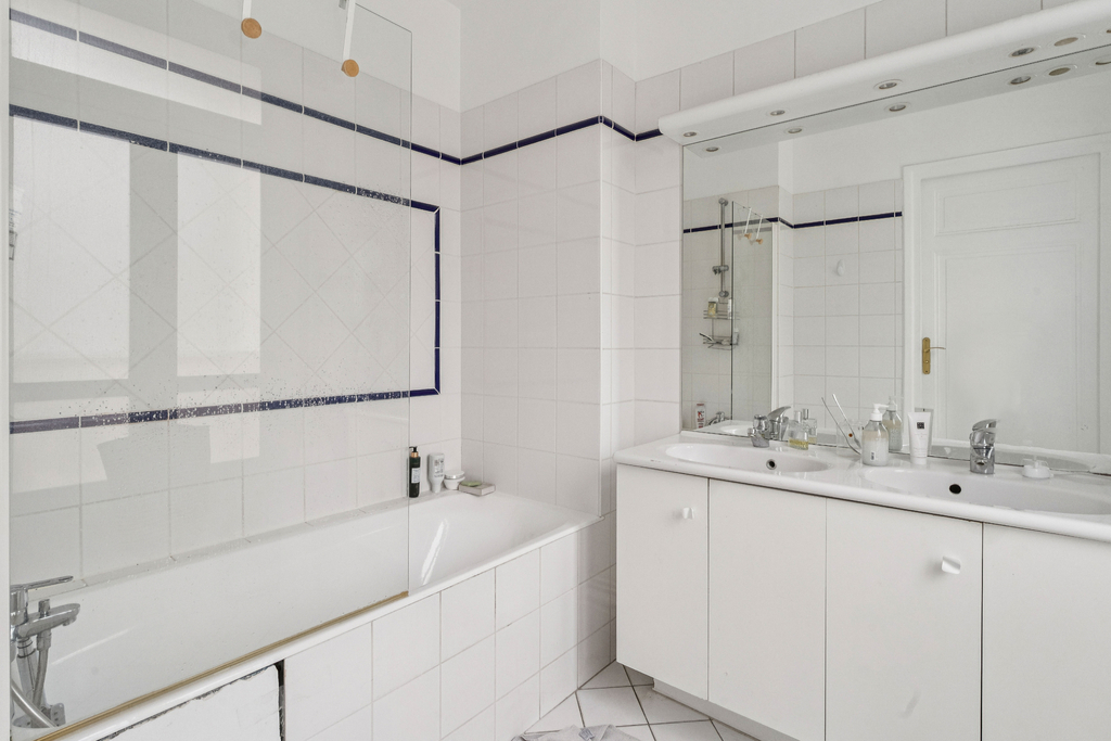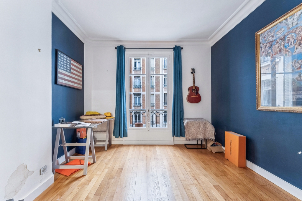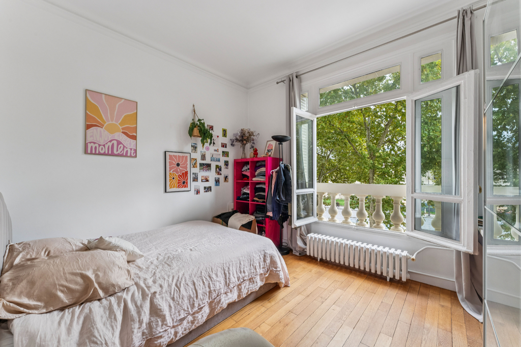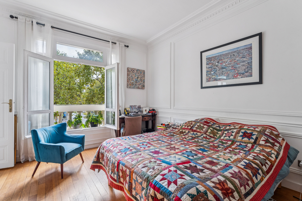 La partie nuit comprend quatre chambres, dont trois véritables suites disposant chacune de leur salle d'eau ou salle de bain attenante. Une buanderie, discrètement intégrée à proximité de cet espace, complète l'agencement. Les nombreux rangements renforcent la fonctionnalité des lieux. Le charme de l'ancien est pleinement préservé : parquet, moulures et hauteur sous plafond d'environ 3 mètres confèrent à l'ensemble une élégance parisienne intemporelle.