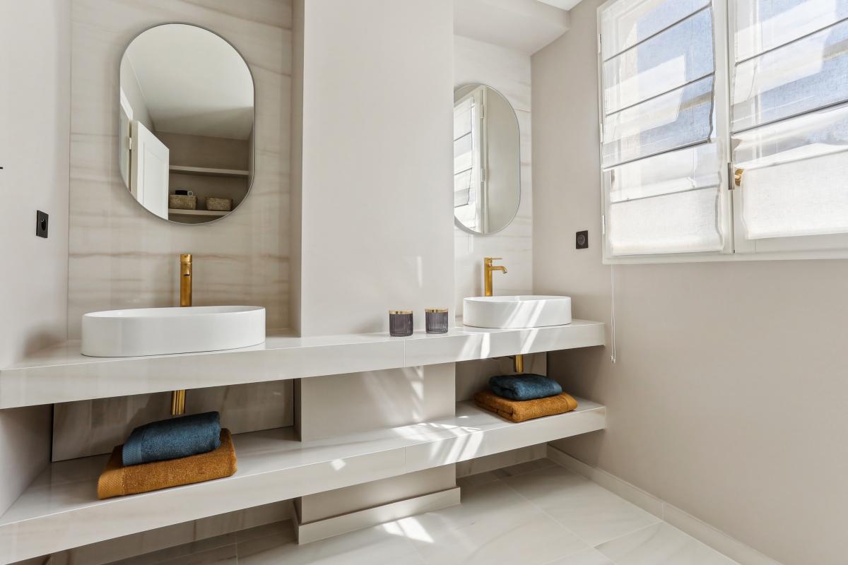 Actuellement en rénovation complète avec possibilité d'une configuration personnalisée : une entrée, un séjour/cuisine, deux chambres, deux salles d'eau, dont 1 avec WC et un WC invités. Le bien est doté d'équipements haut-de-gamme et de rangements intégrés et sur-mesure.