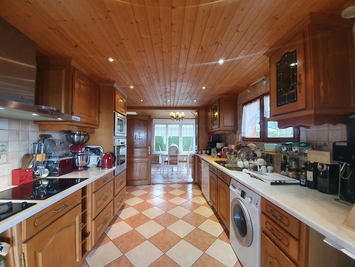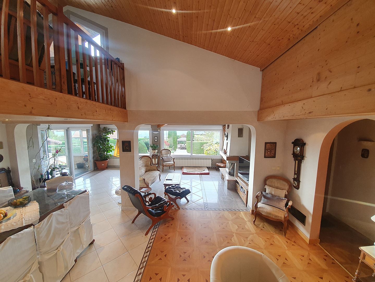Le rez-de-chaussée supérieur comprend un hall d'entrée avec un aménagement de placards intégrés sur mesure, un WC visiteur, une spacieuse cuisine équipée traversante avec un coin repas côté Est et une agréable véranda côté Ouest plongeante sur le parc et sa piscine ; la pièce de vie de 60 m² entièrement vitrée bénéfice d'une vue panoramique sur le lac et les montagnes, ce lumineux salon/séjour avec cheminée est agrémenté d'une mezzanine offrant un espace détente.