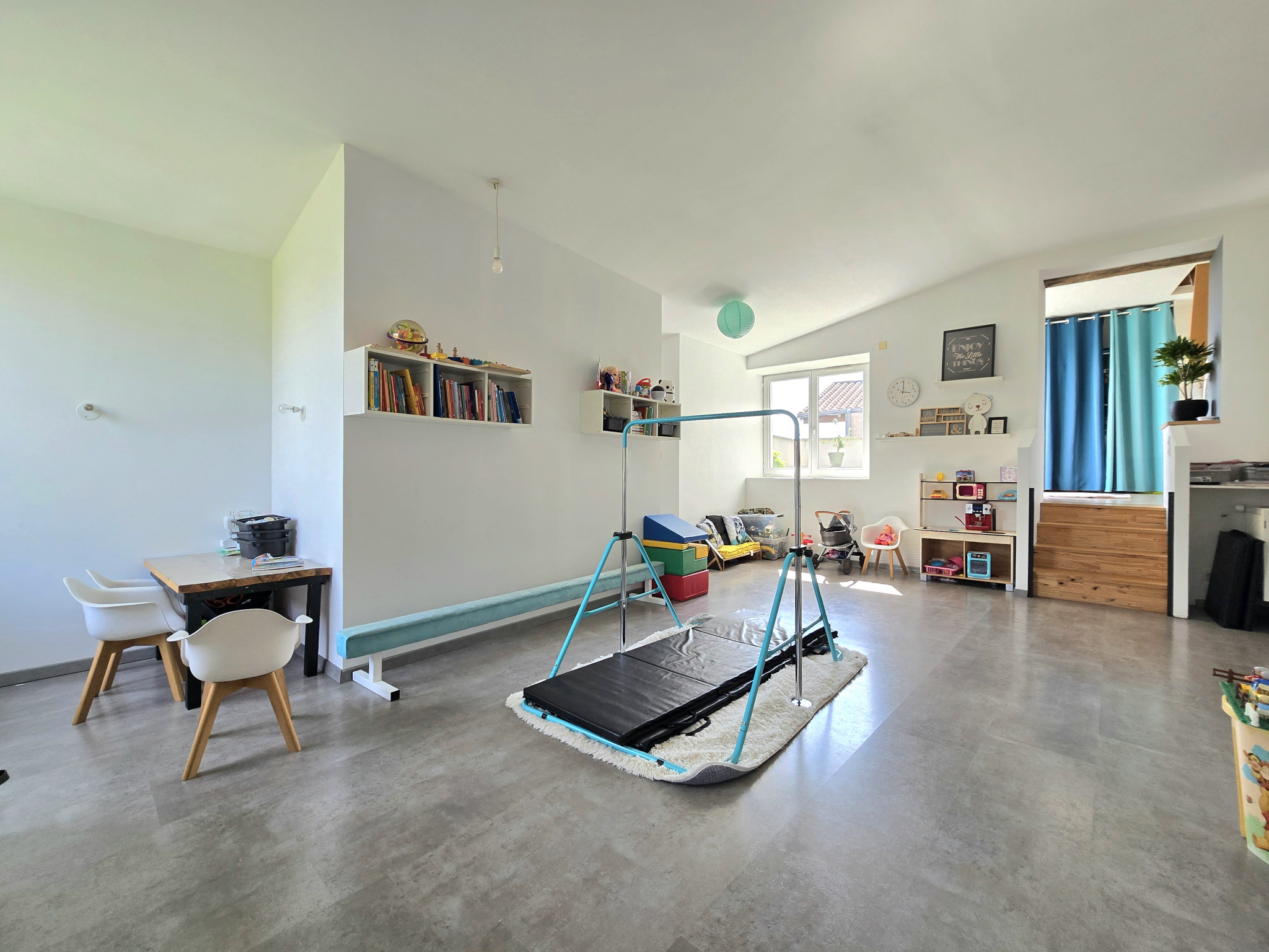 À l'étage, la grande salle de jeux centrale -- coeur de la maison pour les enfants véritable -- dessert trois chambres, un bureau, une salle d'eau et un deuxième WC. L'une des chambres bénéficie d'un dressing aménagé.
