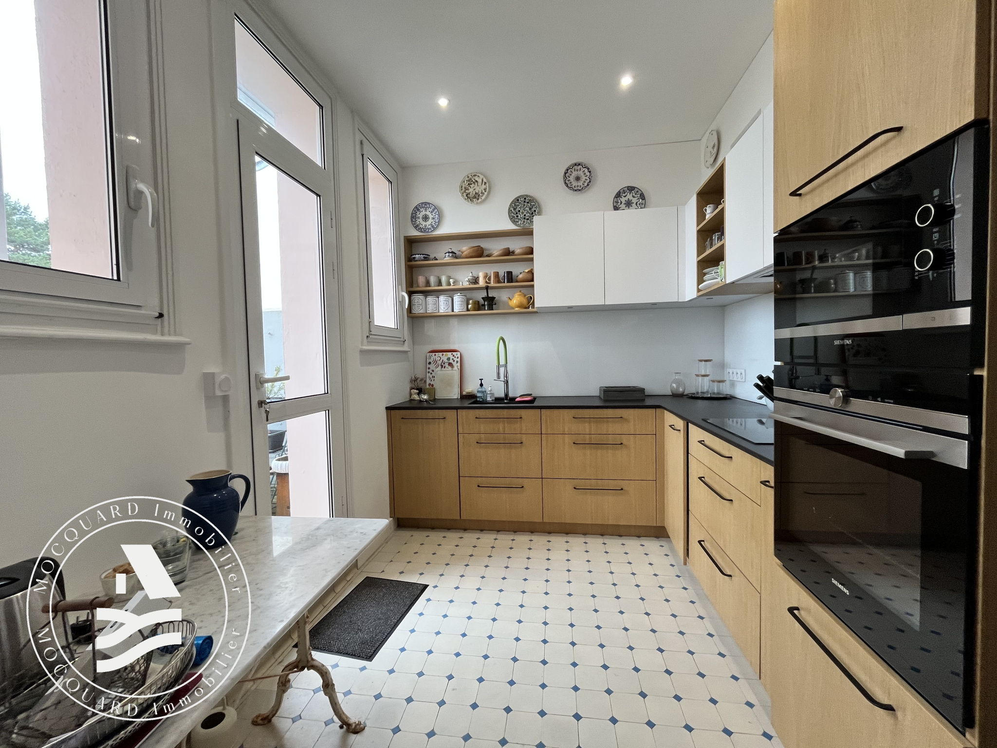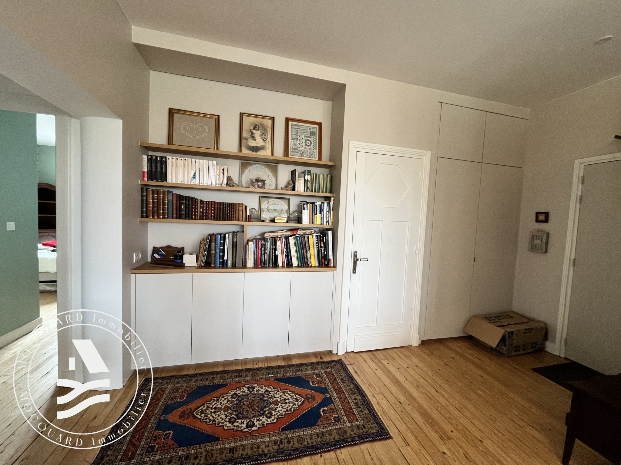 Une belle entrée avec placards mène à une pièce de vie lumineuse où le parquet ancien et la superbe bibliothèque créent une ambiance chaleureuse et raffinée. La cuisine, joliment aménagée, s'ouvre sur un balcon agréable, idéal pour profiter d'un moment de détente.