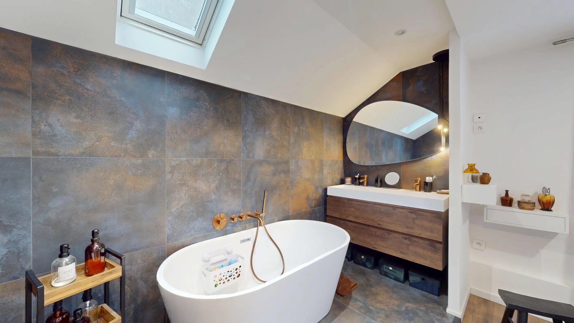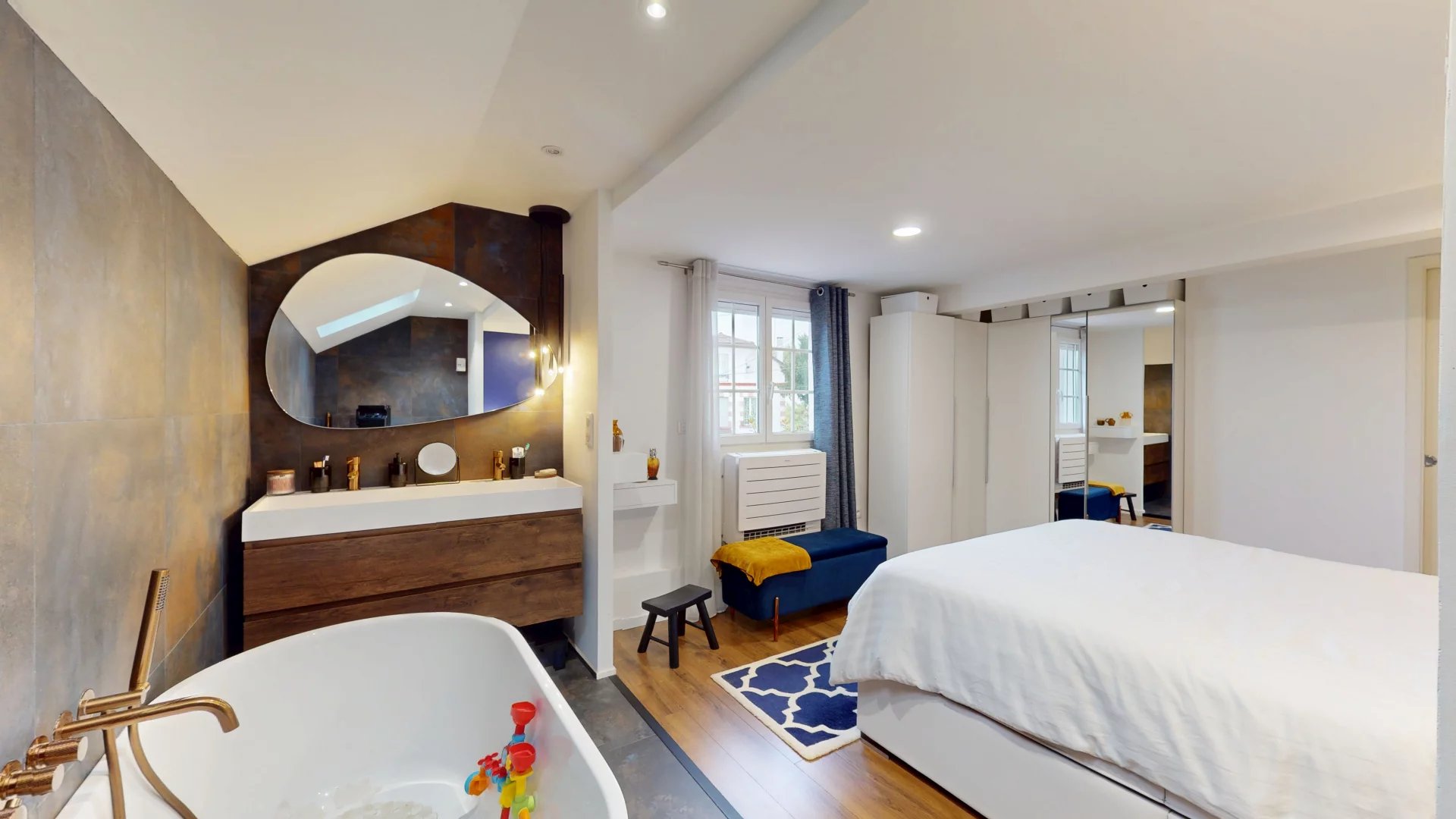 À l’étage, vous découvrez deux chambres spacieuses, dont une véritable suite parentale à couper le souffle de 17m2, avec salle de bain privative et baignoire centrale façon suite d’hôtel. Confort garanti toute l’année grâce à la climatisation dans les deux chambres.