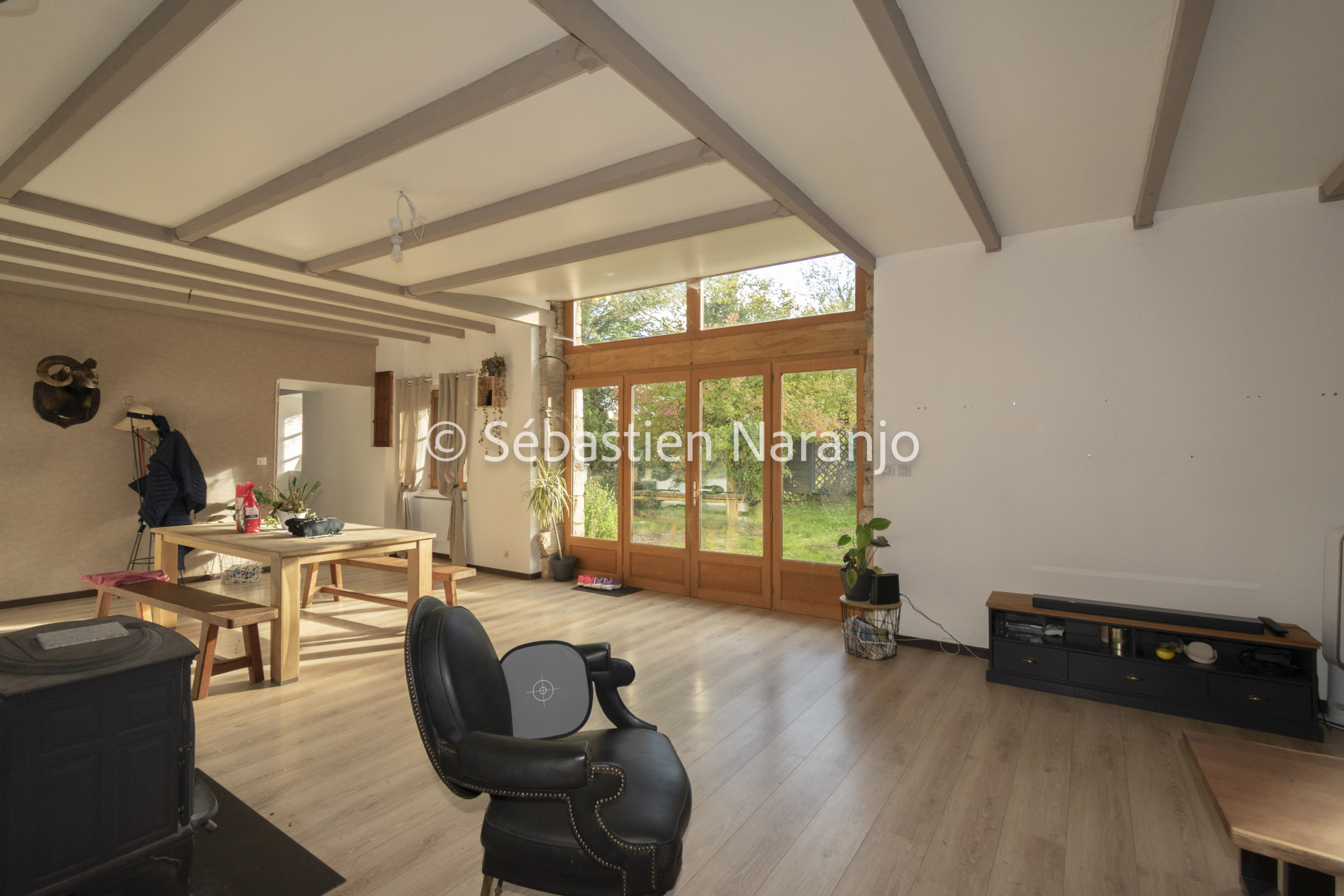 La maison est partiellement équipée de double vitrage, la fibre est installée, et le chauffage est assuré par un poêle à bois.