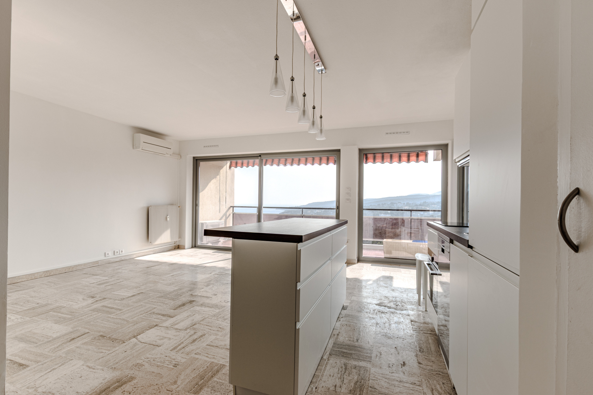 Il dispose d'une cuisine ouverte équipée design avec équipement électroménager haut de game, et de larges baies vitéesinvitant la mer à chaque instant .