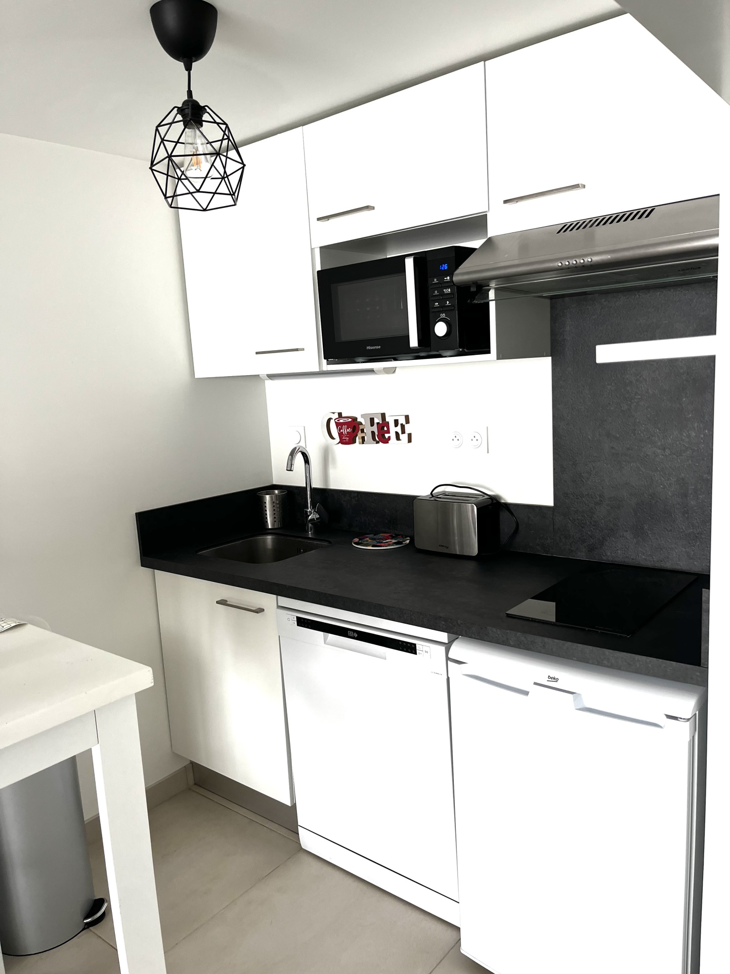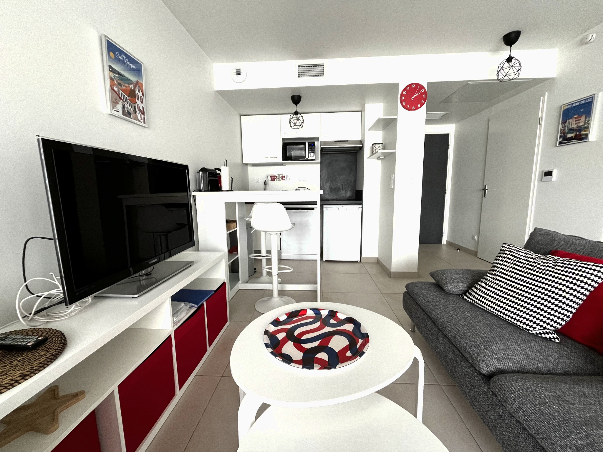 Il se situe au 3éme étage et se compose d'une entrée avec placard desservant un salon avec sa cuisine ouverte tout équipée, d'une salle d'eau avec toilettes, d'une spacieuse chambre avec un grand placard, et d'une buanderie. L'appartement est doté également d'une terrasse de 8m2 donnant sur le jardin privatif de la résidence. Il est équipé d'une climatisation réversible dans le salon, d'un cumulus thermodynamique dans la buanderie. La décoration soignée ainsi que les prestations de grandes qualités dans l'appartement et dans les parties communes en font un bien rare sur le marché.