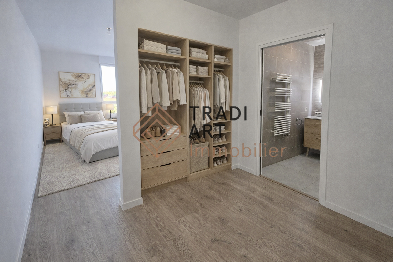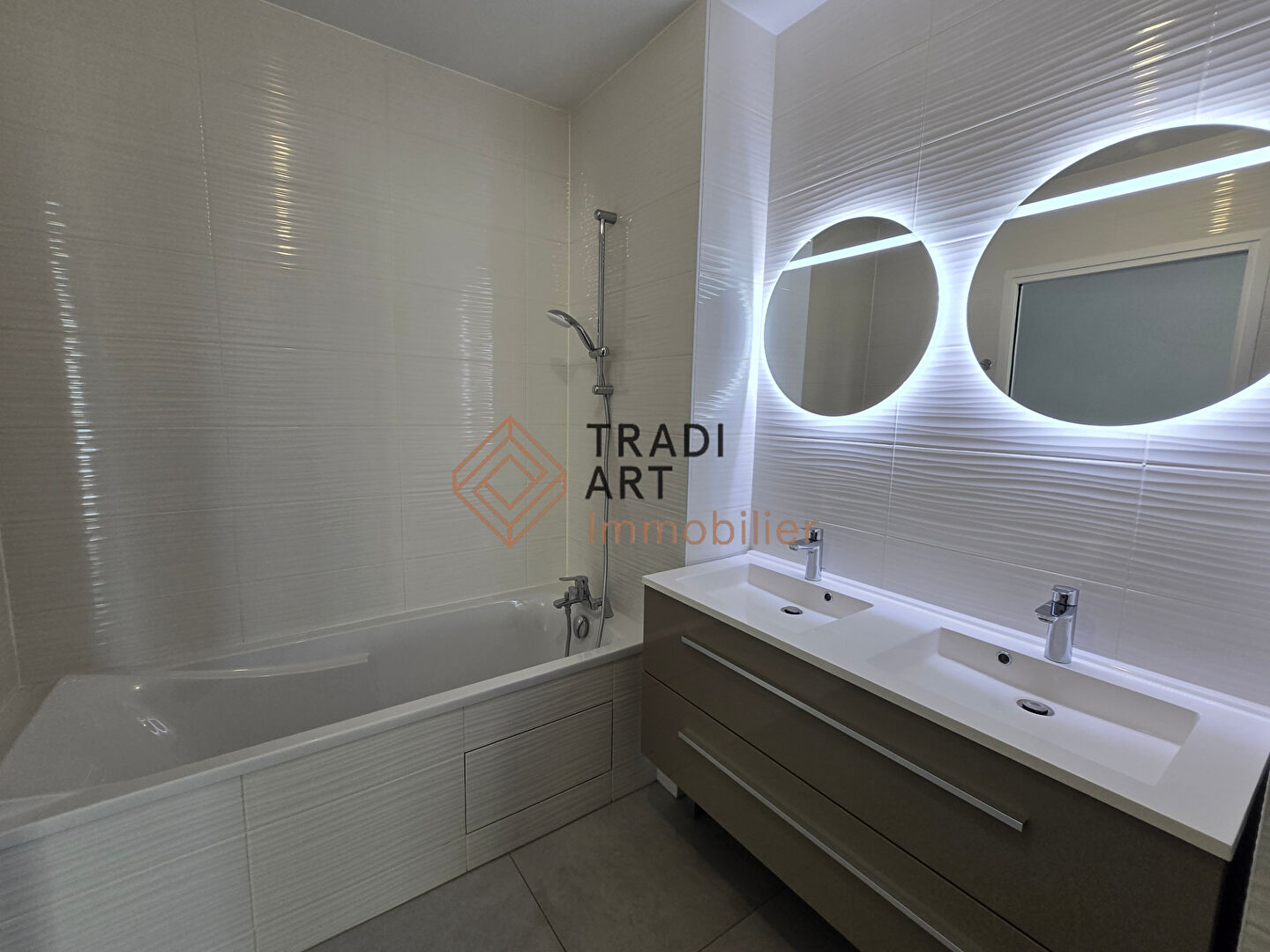 Il se compose d'une entrée avec placard, d'une belle cuisine aménagée et entièrement équipée (four, plaque, hotte, micro-ondes, réfrigérateur/congélateur, lave-vaisselle, cave à vin) ouverte sur un séjour lumineux, donnant tous deux sur une terrasse de 15 m² exposée plein sud.