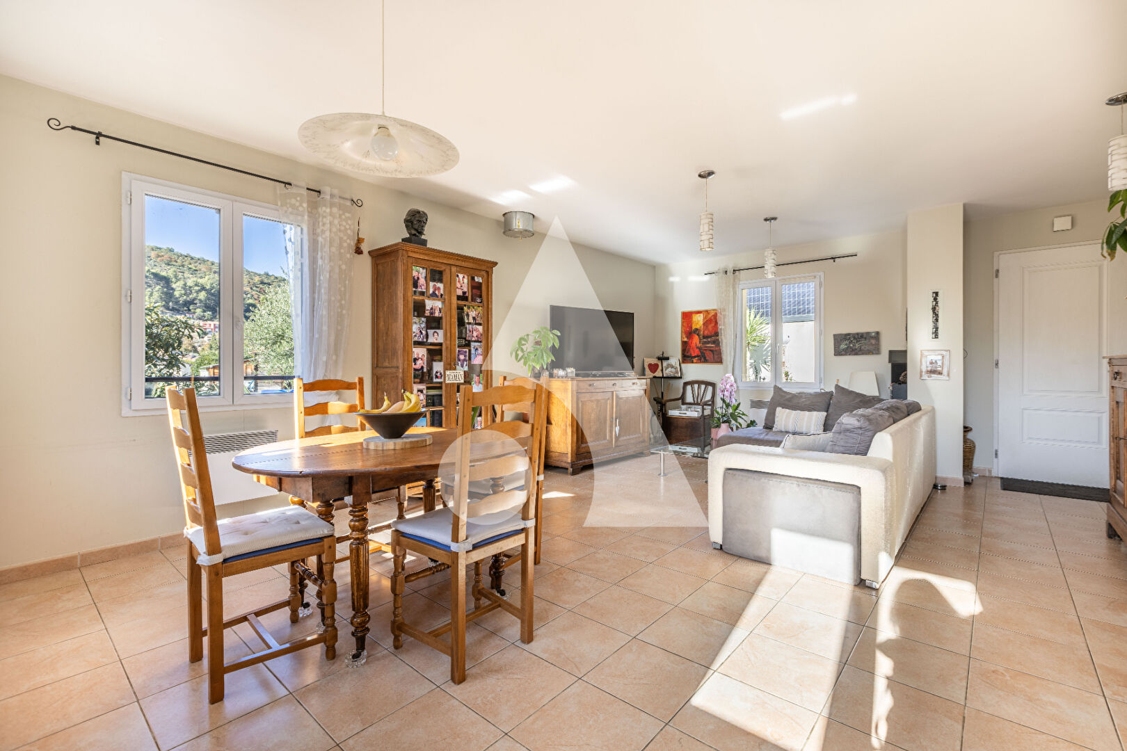 À l'extérieur, une belle terrasse prolonge l'espace de vie et donne sur une piscine parfaitement ensoleillée, idéale pour profiter du calme et du panorama.