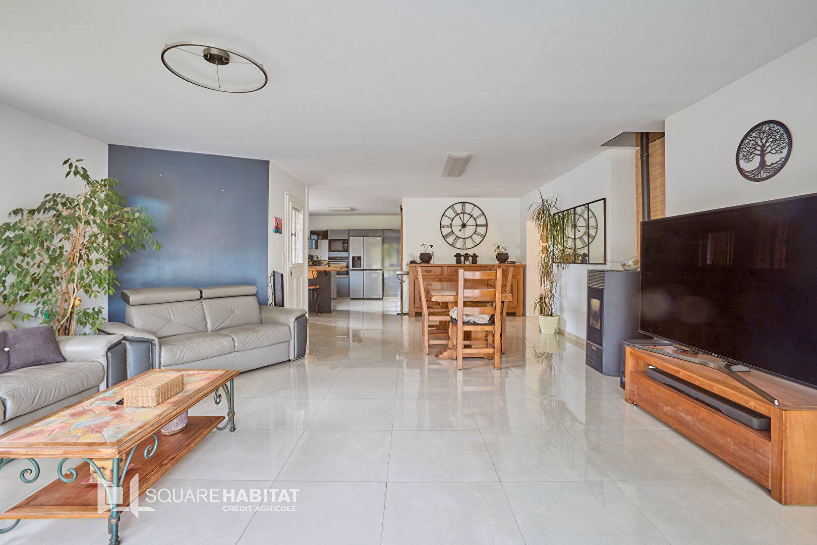 Vous y découvrirez une grande pièce de vie baignée de lumière, accompagnée d'un poêle à granulés, ainsi qu'une cuisine ouverte aménagée/ équipée et cellier attenant donnant sur le garage.